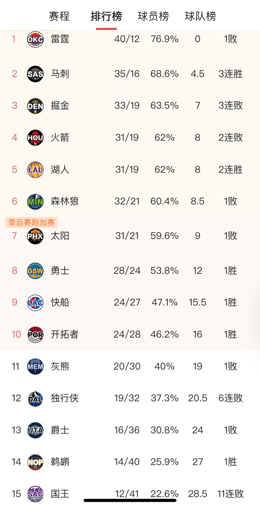 本赛季截至2026年2月7日的NBA西部球队实时战绩排行榜如下: 西部排名(战绩/胜率/胜差/近期状态) 1. 雷霆:40胜12负,76.9%,0,1连败 2. 马刺:35胜16负,68.6%,4.5,3连胜 3. 掘金:33胜19负,63.5%,7,3连败 4. 火箭:31胜19负,62%,8,2连败 5. 湖人:31胜19负,62%,8,2连胜 6. 森林狼:32胜21负,60.4%,8.5,1连败 7. 太阳:31胜21负,59.6%,9,1连败 8. 勇士:28胜24负,53.8%,12,1胜 9. 快船:24胜27负,47.1%,15.5,1胜 10. 开拓者:24胜28负,46.2%,16,1胜 11. 灰熊:20胜30负,40%,19,1连败 12. 独行侠:19胜32负,37.3%,20.5,6连败 13. 爵士:16胜36负,30.8%,24,1连败 14. 鹈鹕:14胜40负,25.9%,27,1胜 15. 国王:12胜41负,22.6%,28.5,11连败 关键看点 • 榜首格局:雷霆稳居西部第一,马刺凭借三连胜稳居第二,掘金遭遇三连败滑落至第三。 • 中游混战:火箭、湖人、森林狼、太阳四队战绩胶着(31胜-32胜区间),排名竞争激烈;湖人近期两连胜,状态回暖。 • 附加赛争夺:勇士、快船、开拓者位列7-10名,处于季后赛附加赛区域。 • 下游态势:独行侠六连败、国王十一连败,两队目前排名靠后。