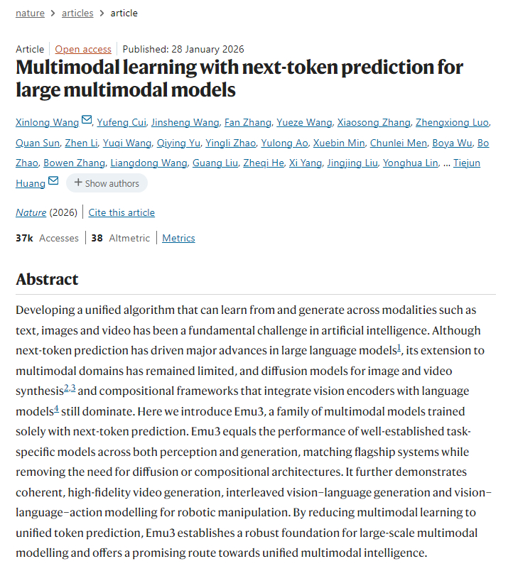 北京智源2018年成立,首任理事长是著名学者黄铁军,也是文章通讯作者。前段时间我正好调研了,没想到2026年1月28日发了大文章。