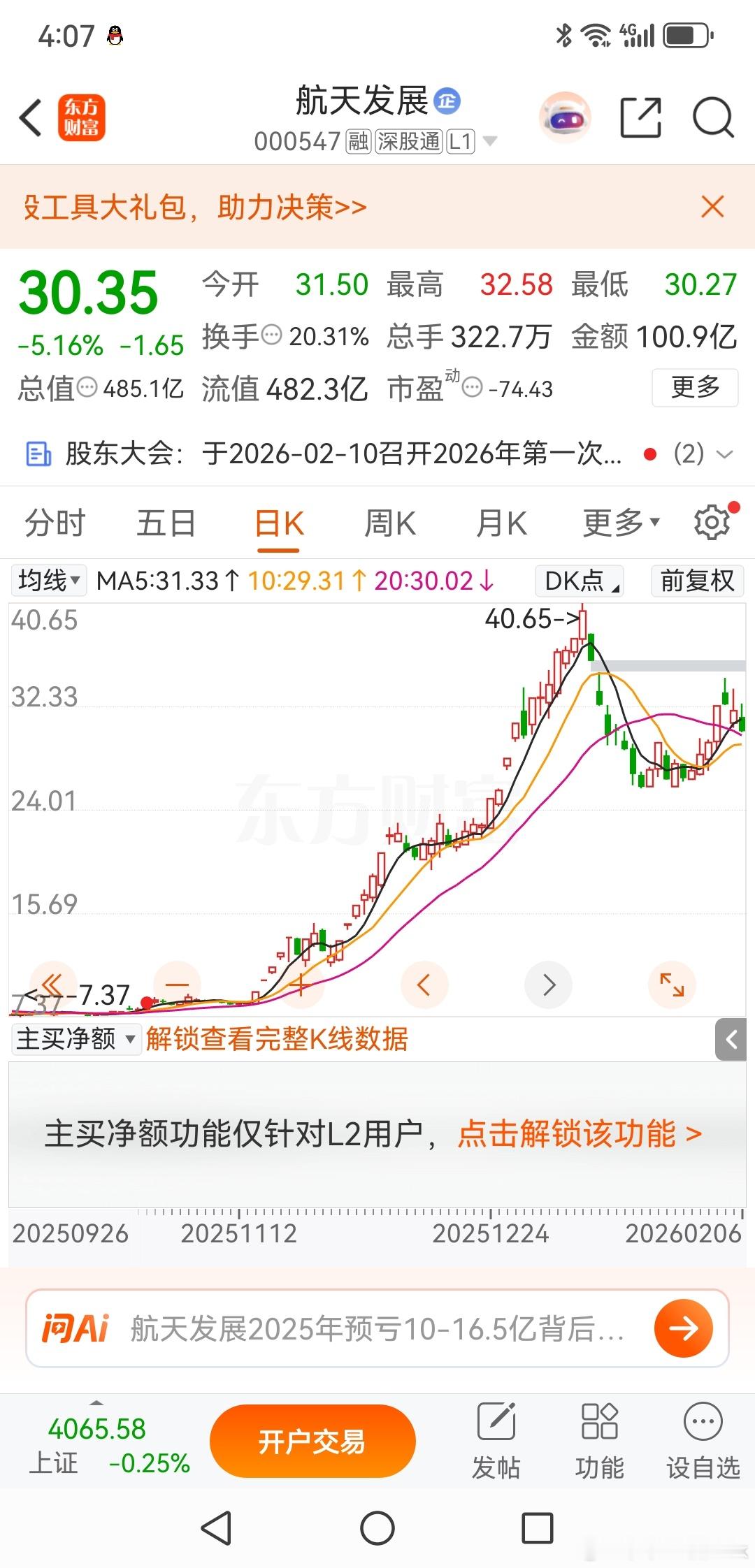 航天发展,反弹已于2月4日结束航天发展,前两天有位群友让我盯一个,是前期追高被套