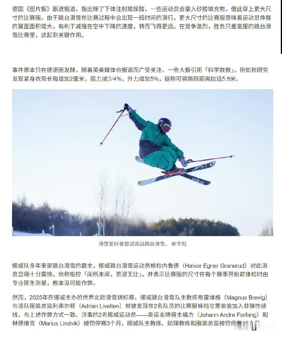 对了,德国《图片报》爆料:跳台滑雪界可能有运动员为了飞得更远,在赛季开始前的3D身体扫描测量前,给牛子打玻尿酸,临时增大体积(周长可增1-2厘米),希望这样能获得更大升力,可将跳跃距离拉远。更大升力!跳台滑雪比赛服尺寸受国际滑雪联合会(FIS)严格管制,目的是防止多余布料产生额外升力。更大尺寸的衣服理论上可增加翼面面积、改善空气动力学、减缓下降速度、延长飞行距离——研究显示,厘米级变化可能带来数米距离优势,在毫厘决胜的项目中很关键。所以,传闻中有些运动员给牛子打玻尿酸,很多吃瓜群众在大为震惊中马上就信了——理论上并不是没有可能啊!世界反兴奋剂机构(WADA)总干事Olivier Niggli 在2026年2月5日米兰冬奥新闻发布会上表示:他们会调查此事是否构成兴奋剂违规 或违反体育精神 ,但目前没有具体证据,也没有听说过细节。玻尿酸本身不是禁药,常用于医美填充,WADA主要针对兴奋剂而非这类“规避规则”的物理操纵手段,但如果证据出现,会评估是否落入其管辖范围。国际滑雪联合会(FIS)也回应称,从未有证据显示任何运动员实际这样做。挪威顶尖选手Halvor Egner Granerud等公开表示震惊并“辟谣”,称测量由专业医生监督、穿标准内裤、难以作弊。奥地利选手Mika Vermeulen曾在播客中提到类似传闻,但无实锤。但是,2025年在挪威主办的世界北欧滑雪锦标赛,挪威跳台滑雪队主教练布雷维格与该队服装总监利弗尔顿就被发现在2名队员的比赛服裤裆位置偷偷加入非弹性缝线,与给牛子打玻尿酸的作弊目的一致。涉事的2名挪威运动员——奥运金牌得主Johann Andre Forfang 和Marius Lindvik被罚停赛3个月,挪威队主教练、助理教练和服装总监被罚停赛18个月。你挪威人出来辟谣没说服力啊……总之,竞技体育在某些方面也确实不断在震撼全世界。