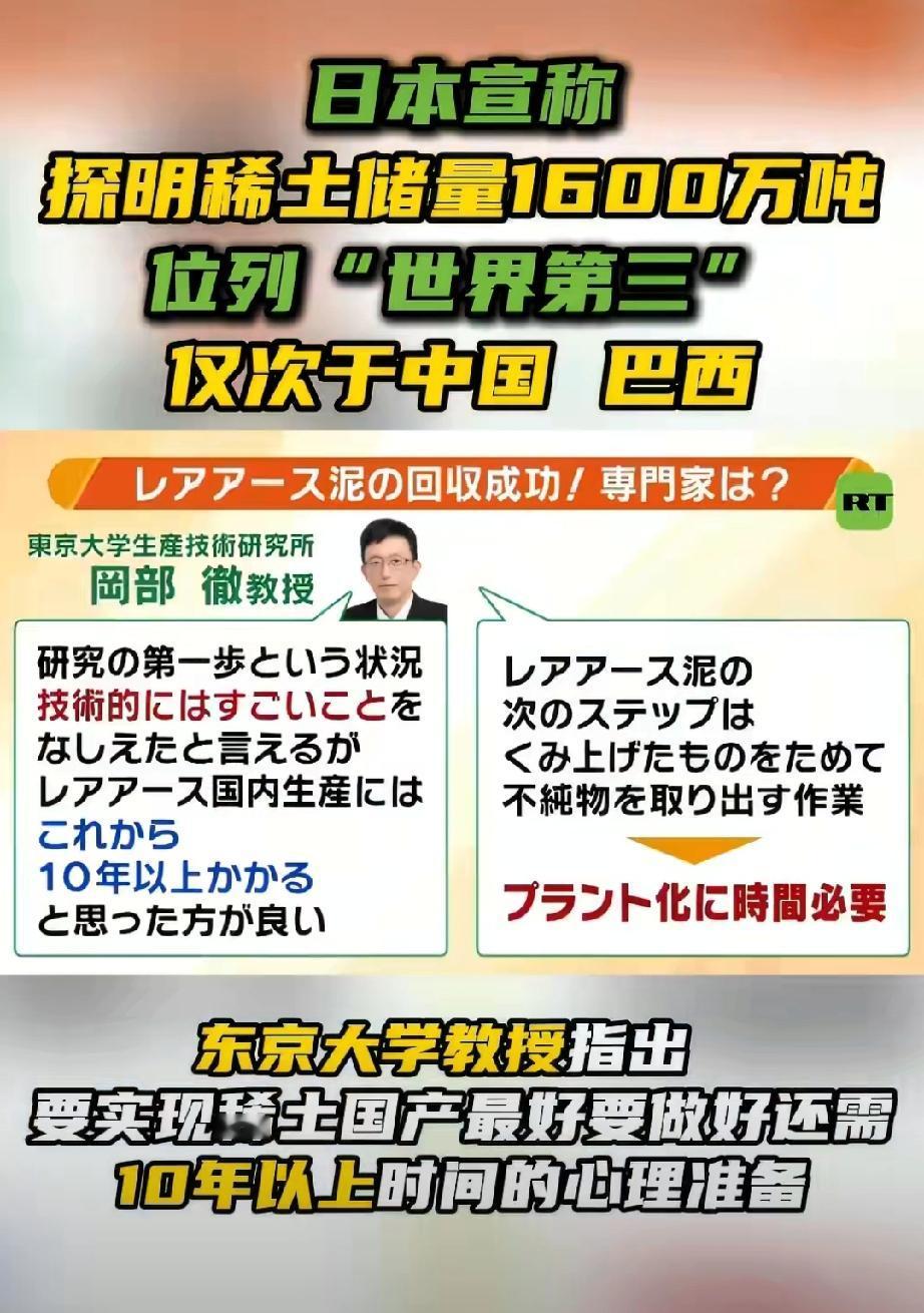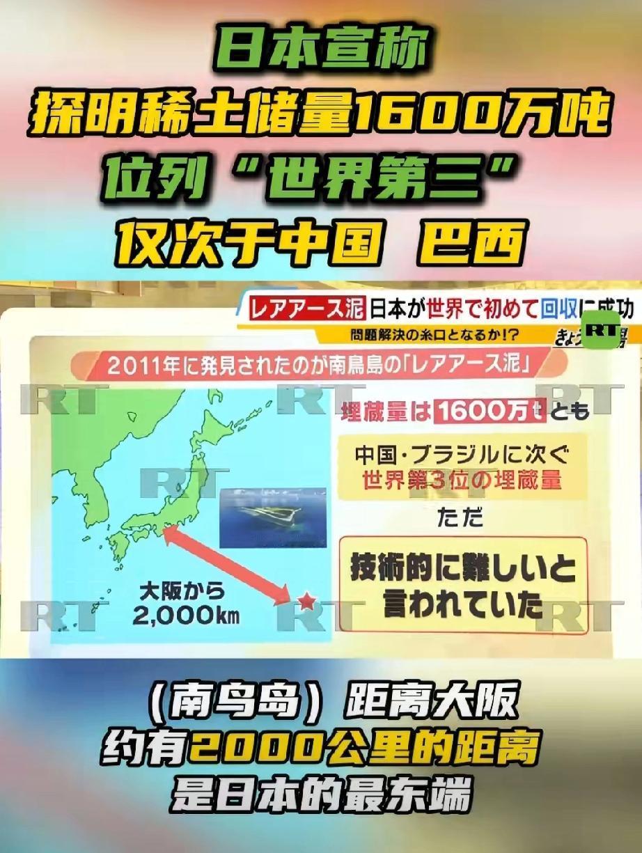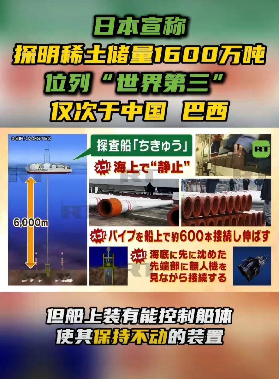 日本炒了14年的稀土梦!1600万吨是老数据,新试采仍难落地 最近日本高调官宣6000米深海试采稀土成功,还说1600万吨储量排世界第三,看着挺唬人,其实这事儿早炒了14年! 早在2012年日本就发现了这片稀土泥,2018年又喊着“够全球用数百年”,结果十多年过去,还是停留在“挖泥巴”阶段。 这次试采35吨泥浆才提炼出70公斤稀土,成本高达11.9万美元/公斤,是国际市场价的150倍,纯纯亏本买卖。 中方回应更绝:“近年一直有类似报道”,一句话点破炒作本质。 要知道日本70%稀土靠中国进口,重稀土依赖度近100%,可深海开采不仅技术没成熟,分离提纯还存在代差,专家说量产至少得等2030年后。 更关键的是,6000米深海采矿环保风险极大,设备故障率高,国际规则还没完善。 说白了,这波操作还是为了缓解资源焦虑,实际离商业化差着十万八千里。 你觉得日本这次能打破14年的炒作循环吗?评论区聊聊~ 国际 军事 日本稀土开采