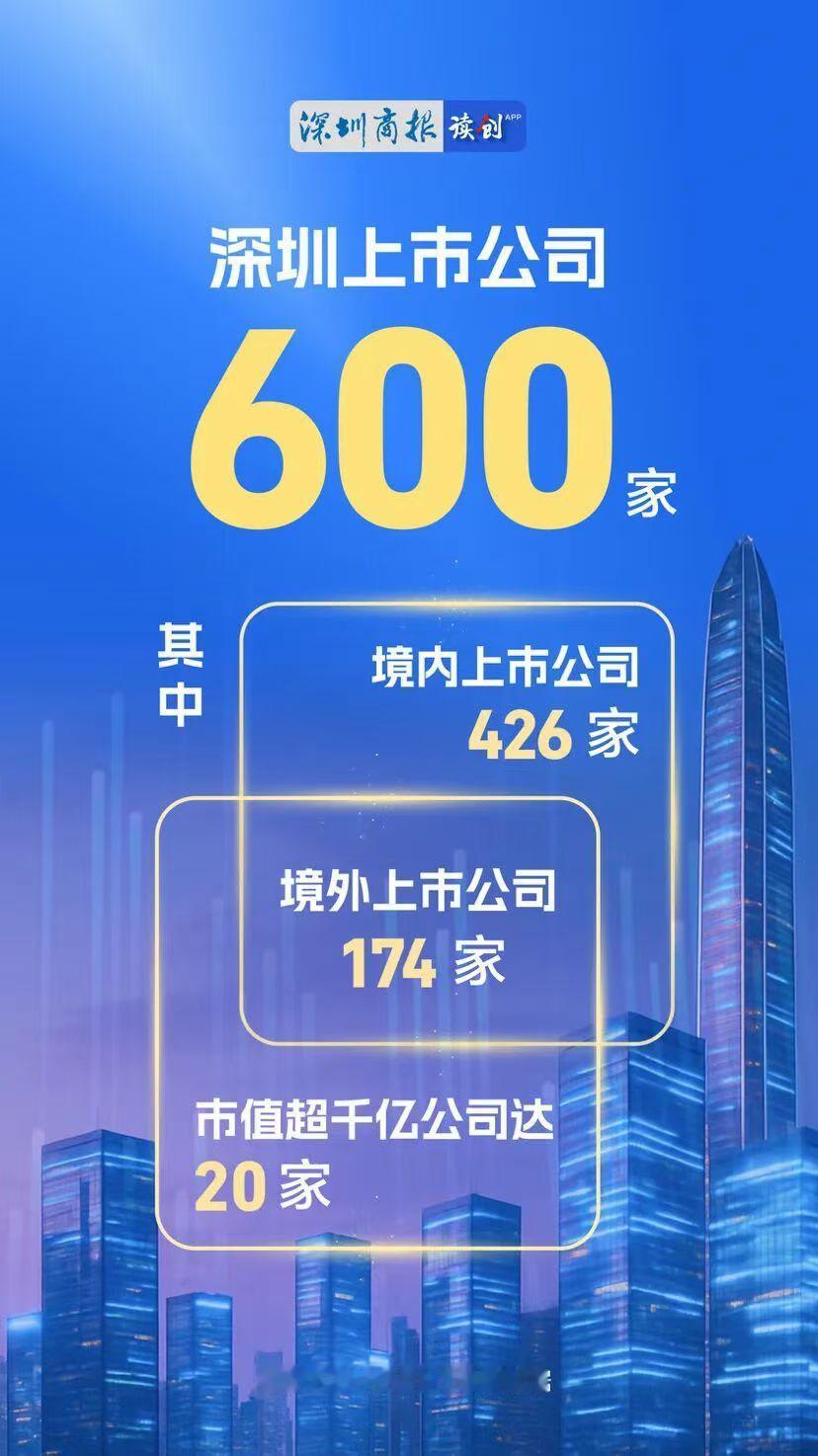 深圳上市公司突破600家,境内上市426家,境外174家,市值超千亿的超20家。