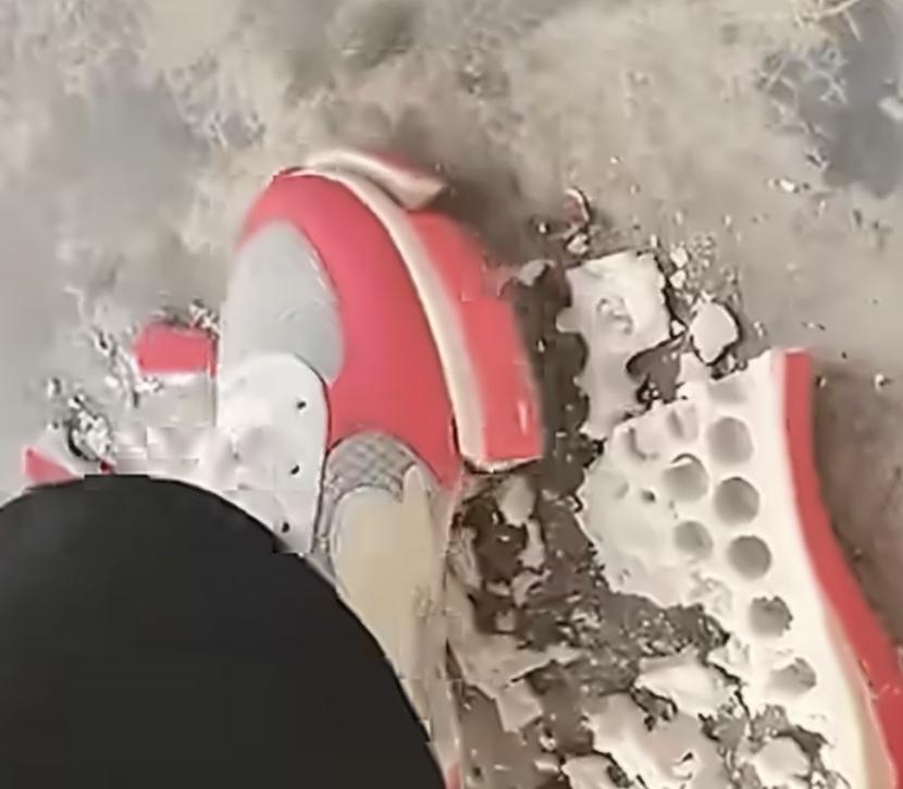 老人舍不得穿的鞋 因氧化掉渣 一名女子穿上家里老人拿给的鞋子走路,刚上脚走,鞋底就因氧化掉渣。 当事人称:“老人平时舍不得穿,当时全家人都笑了,既心酸又搞笑。 ”