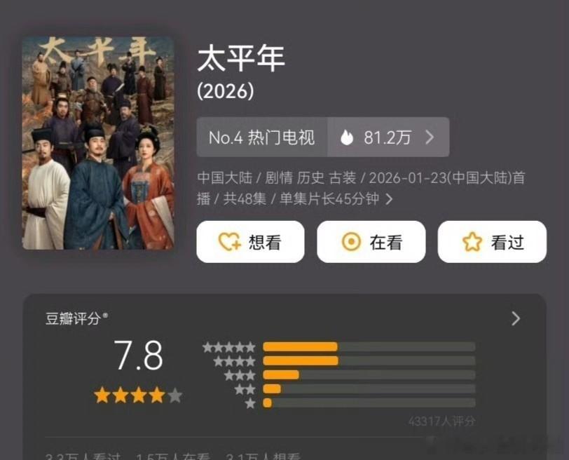 三部新剧豆瓣开分:1.白宇、周雨彤《太平年》7.8,打分人数4.3万。