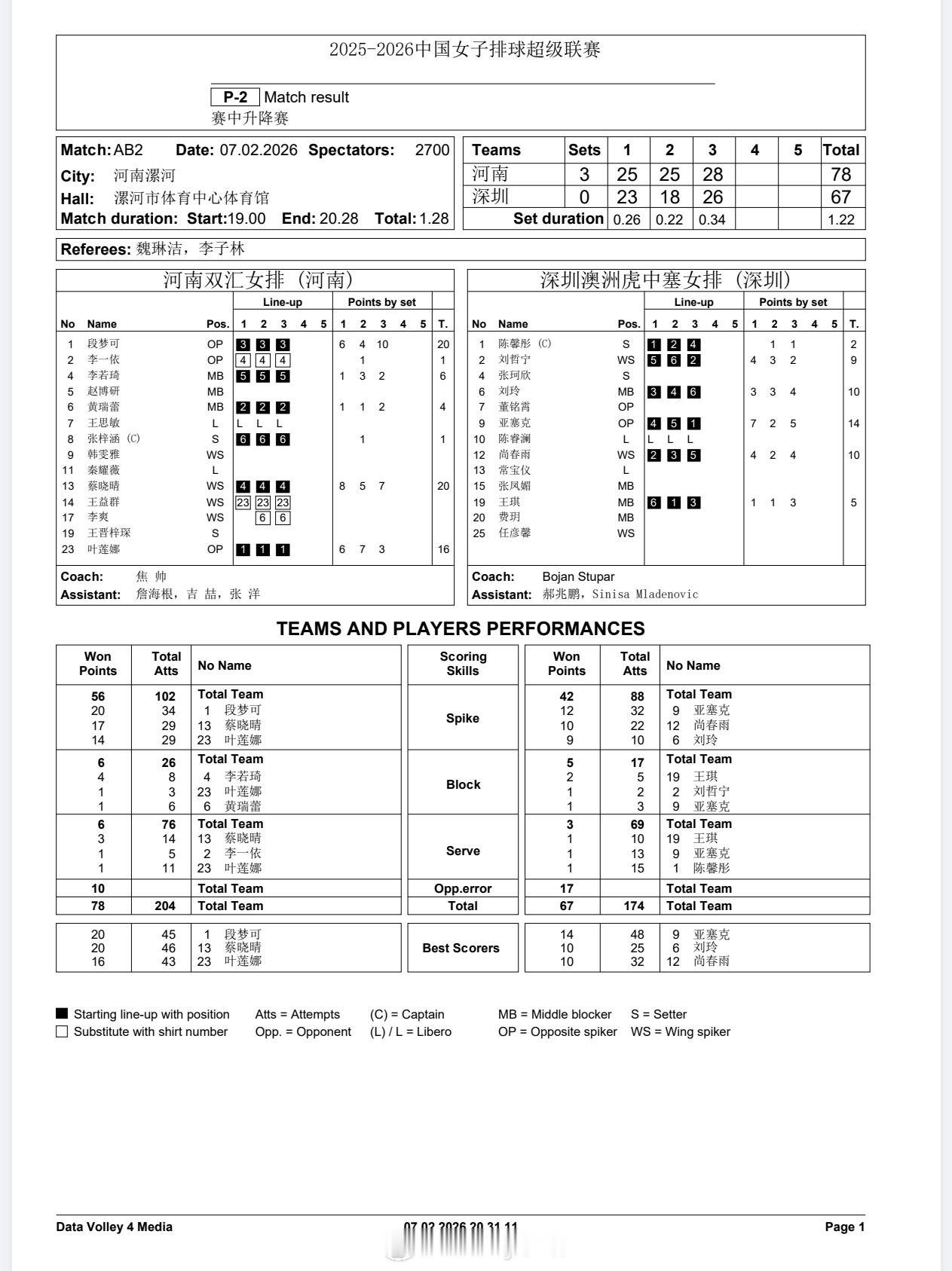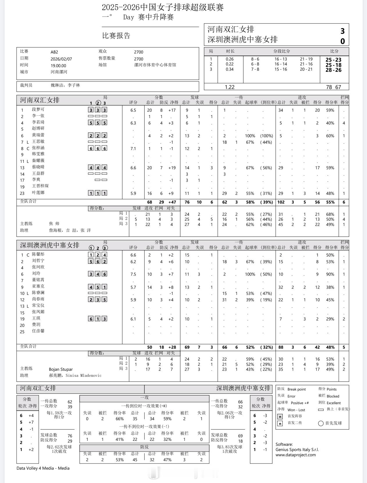 【技术统计】排超联赛赛季中升降赛第一回合,河南女排3比0深圳女排(25-23 25-18 28-26)