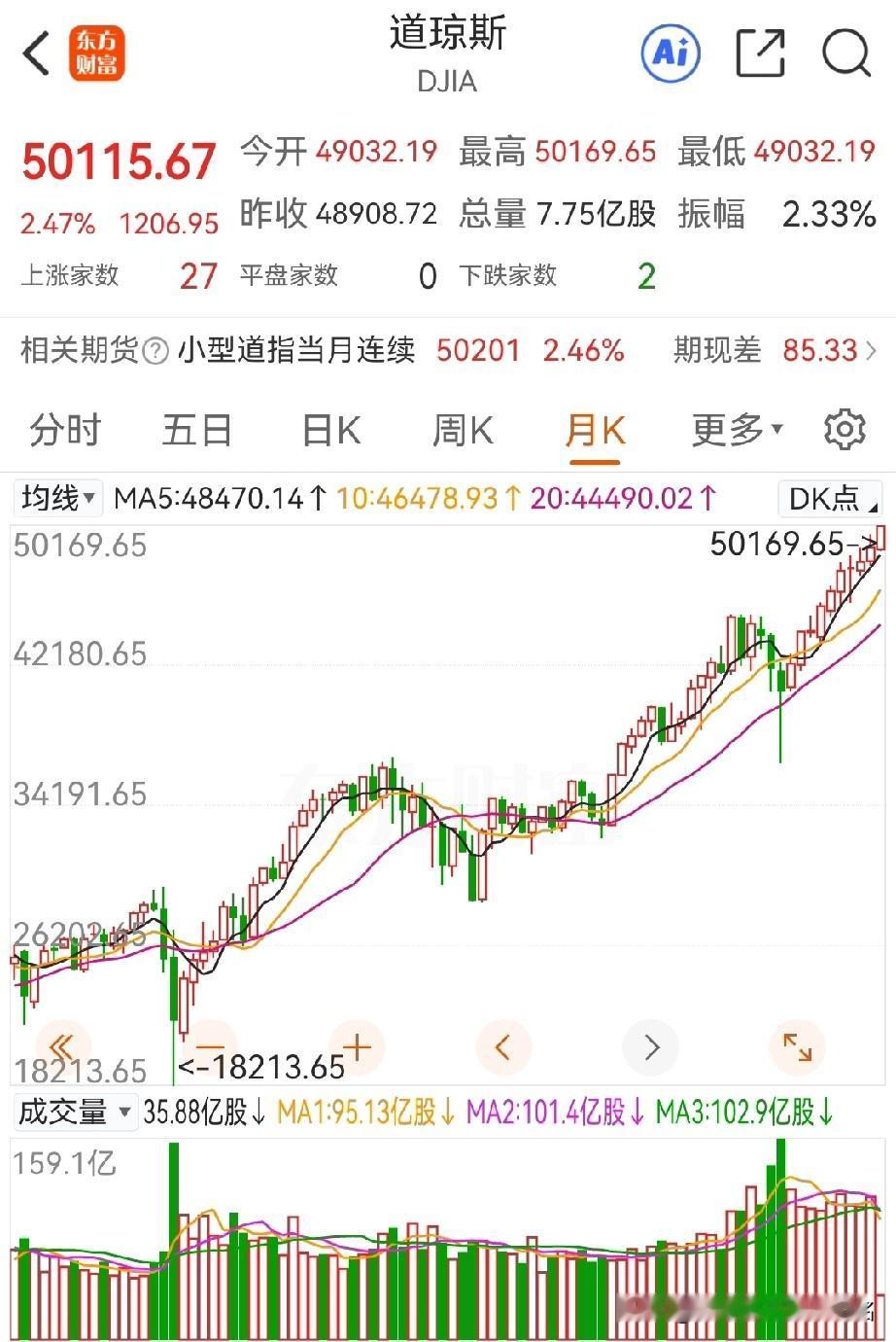 道指上五万点,该怎么看? 对于大A来说,至少外围是正向反馈… 周五,恒生指数走势较弱,大A还好,外围资本市场中,法、德一直高位震荡,还算“正常”,日经居然能挺住,看来老美是出了力的,而美股,周五晚间居然一口气大涨2.47%,再次勇创历史新高站上五万点大关,只能说一句:牛! 美股,对于老美来说,其重要性可以说是仅次于美元(美债)了,包括其大统领,不到万不得已或者说有目的的情况下,老美上上下下,人前背后的人,都不敢让美股崩,而且还得一直涨。 而且,其也有那个条件,除了无限的美元,也没有任何的机构有能力去做空或者带崩他,除非他自爆。 当然,这世上没有永动机,没有只涨不跌的商品,时间或者轮回而已。 所以,短期对大A来说,算是正面反馈,下周值得期待;中期来说,比如今年内,道指站上五万点,并不是好事,短期不崩、中期不崩,但不代表过程中随时小崩一下;而长期,以轮回计,比如98→08→18→28年? 这肯定是大概率事件,甚至,由于处于“大.变.局.节.点”,提前也是大有可能。 又所以,大A的这一轮夹缝中的牛市,时间窗口够是够了,却也不是可以随便“挥霍”的,至少,个人投资者要做到心中有数。 十年慢牛,听听就好。
