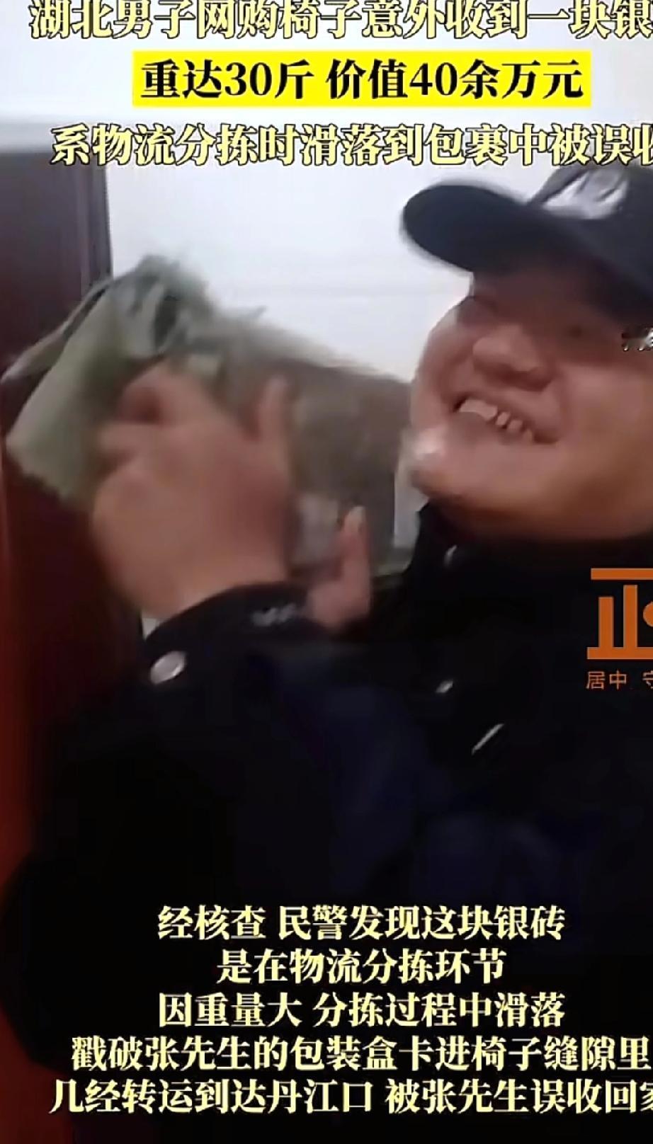 天上掉馅饼!湖北一名男子日常网购一把椅子,满心期待收到快递后,拆开却发现根本不是椅子,而是一块重达30斤的银砖,价值40万。面对这突如其来的贵重物品,他的做法,让全网点赞! 男子在网上买了把椅子,拆开快递却惊呆了:里面没有椅子,只有一块银光闪闪的大砖头!后经确认,这是一块重达30斤、市场价值高达40余万元的真银砖。 原来是物流分拣时,银砖意外滑落,阴差阳错被装进了他的包裹。面对这笔突如其来的巨额财富,男子没有丝毫犹豫,立刻主动联系了警方和快递公司。 想象一下这个场景:满心期待地拆开快递箱,没有看到期待的商品,却是一块从没订购过的金属。 普通人可能会疑惑、好奇,甚至上网查查这是什么。当知道这竟是一块价值足以在小城付套房首付的银砖时,那一刻的内心波动可想而知。 这并非电影情节,而是一次真实的“道德测试”。这块银砖,本是物流运输中的贵重物品,因分拣失误“跑”错了地方。它的背后,可能有焦急的失主,也可能牵连着快递员的责任与赔偿。 男子没有被巨额财富晃花眼,他的第一反应是“这不是我的东西”,并迅速选择了物归原主。整个过程中,他展现出的淡定与正直,比那块银砖更加耀眼。 在无人知晓、唾手可得的巨大利益面前,他主动选择了诚信这条“难走的路”。就像网友说的“君子爱财,取之有道,佩服!” 在有些人看来,这可能是一次“错过”的暴富机会;但他用良心换来的踏实夜晚,比40万更值钱。最终,这块“迷路”的银砖回到了它本该去的地方。 他归还的,是人与人之间最基本的信任,是在虚拟购物和复杂物流中,那份关于“安全”和“可靠”的承诺。 财富固然吸引人,但内心的纯净与安宁,才是无法被估价的无价之宝。 生活偶尔会像这次错发的快递一样,给我们出一些意外的考题。 而每一次像这样毫不犹豫的“物归原主”,都是在为我们共同生活的世界,增加一份安全感与温暖。为这份闪亮的诚信,点赞!