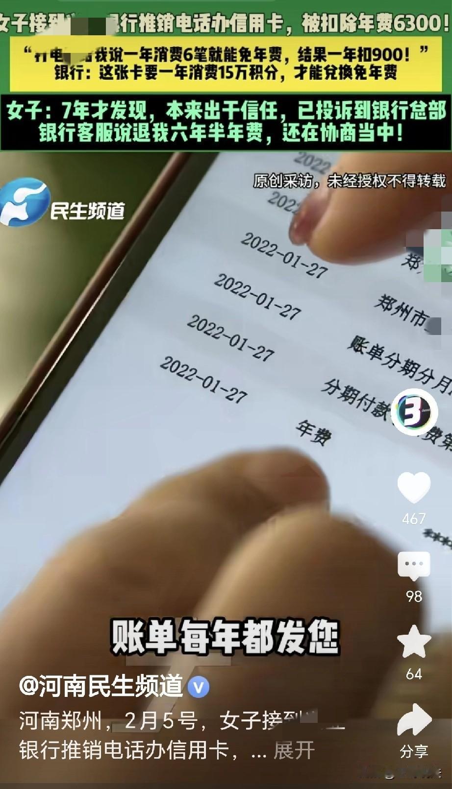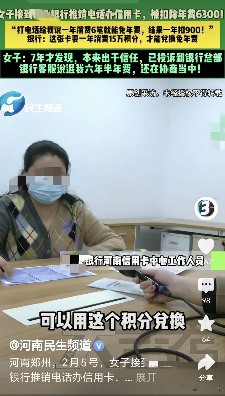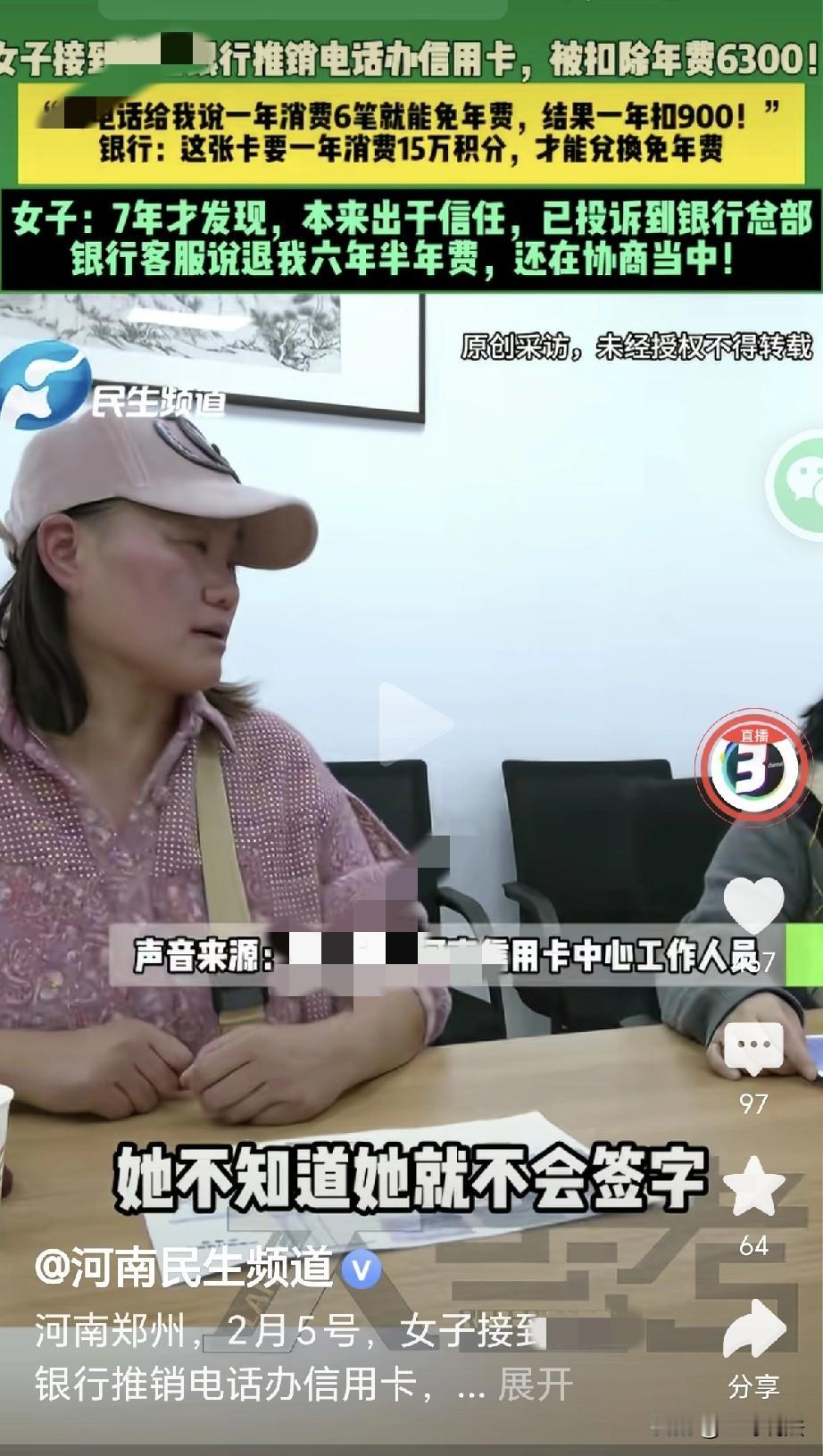 河南郑州,一女子接到银行电话,银行推销办信用卡,业务员在电话里说,一年消费6笔就能免除年费,女子连用了7年,最近突然发现,银行每年收卡费900元,7年收了她6300元,女子急了,找银行理论: 推销员只说好处,没说会收年费,我要知道会收年费,我就不要这张卡了!银行: 是你自己同意的,15万积分才能兑换免年费! 王女士接到银行的电话,业务员在电话里推销信用卡。 信用卡顾名思义,如果正常使用,就能积累下你的信用。 有了优秀的信用,就能享受很多的福利,每年会有积分,积分都能换成喜欢的礼物。 业务员卖力的推销,把信用卡的好处说的了一遍,这张卡每年只需要消费够6次,就能够成功的免除年费。 王女士听的高兴,消费6笔也不是个难事,更何况信用卡能够透支,一旦遇到急事,即便没钱也能用来消费。 王女士欣然同意办理,业务员很快就给她办理成功。 等她拿到信用卡的时候,发现用这张卡购物特别的方便。 她这个月用,下个月还,遇到收紧的时候,还能透支取一些现。 王女士用了几次,越用越感觉方便,她每年都会消费多次,次数多的她记不清楚。 这信用卡她一用就是7年,要说方便那是真的方便。 可是最近,她翻看账单,她觉得没花多少钱,账单怎么有这么高的金额? 她不停的翻看,突然有一笔900的支出印入了眼帘,明细里显示,银行收了她900元卡费! 王女士吓了一跳,她赶紧又往前面翻去,这一翻看,她彻底怒了! 原来7年的时间,银行共计收了她6300元卡费,这个数字,比她的工资都高了许多。 王女士找到银行,问这究竟是怎么回事,可银行回复,她不可能不知道会收年费! 工作人员认为,如果你不知道,你就不会签字! 王女士更加的生气,你又不是当初的推销员,你怎么知道我知道这事儿? 可银行工作人员却说,每年都给你发过账单! 可王女士认为,我没看过账单,我也不是必须要去看账单的! 到了最后,工作人员表示:您这卡得攒15万积分才能兑换免年费!” 更离谱的是,没人给她说过什么积分,怎么兑换,王女士压根就不了解这些,更没人给她提到过这些。 王女士看说不通了,直接就投诉到了银行总部。 客服表示,给她退6年半的年费,目前还在协商! 有人认为,这是电话里说一套,合同里藏一套,稍不注意,就掉到了坑里。 也有人说,自己家人也被这么坑过,办卡时只说好处,不好的地方根本就不说。 有位网友反映,前几天我也接到某银行电话说给我升级信用卡,什么什么好处,后来我幸好问了一下,她才说年费五六百,要是不问估计会和这个女的一样。 但是也有人说,是自己办卡时没问清楚,不问清楚就办,发了账单不看,这有一说一,作为消费者办卡签字也得注意。 规则都不了解就签字办业务,享受了权益但到付费的时候却不乐意了,如果只说一句我不清楚就可以免责的话那也不公平。 总之,无论让你办啥业务,多留点心,就注定会少一点错误,更千万别信口头承诺,合同条款一定要逐条问清楚。 尤其是年费,积分这些坑,赶紧不对直接挂电话! 对此,你怎么看?