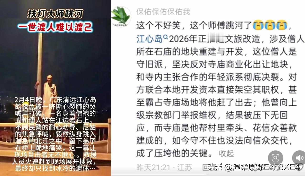 扶灯大师遗体已经打捞上来了,看着他脸上的多处伤口,能想象到他当时是多么无奈与决绝。 大师本名释静觉,是当地回归寺老僧人。大师能普度众生、四大皆空,却忘了这副身躯始终在红尘中,同样需要世俗的认可与钱财。 肉身成佛只是传说,现实中能四大皆空,为寺庙信众做实事已是难得。愿大师早日解脱轮回之苦、早生净土[蜡烛][蜡烛][蜡烛]