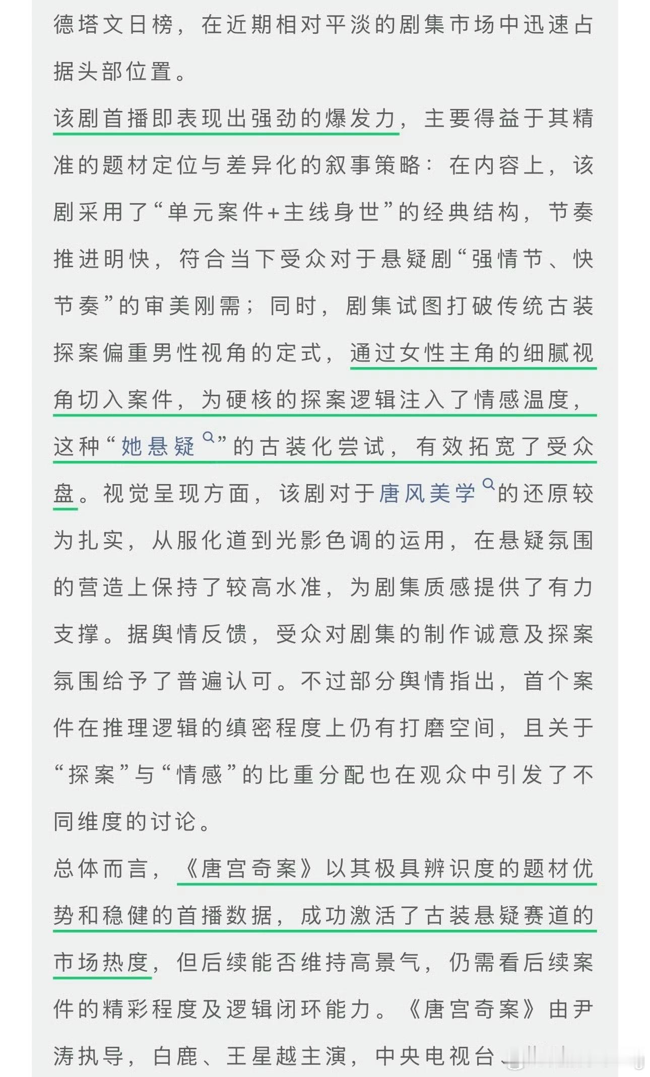 唐宫奇案德塔文评佳白鹿主演的唐宫奇案首播表现出强劲的爆发力,通过女性主角的细腻视角切入案件,为探案逻辑注入情感温度,有效拓宽受众盘…以极具辨识度的题材优势和稳健的首播数据,成功激活古装悬疑赛道市场热度 …白鹿好牛