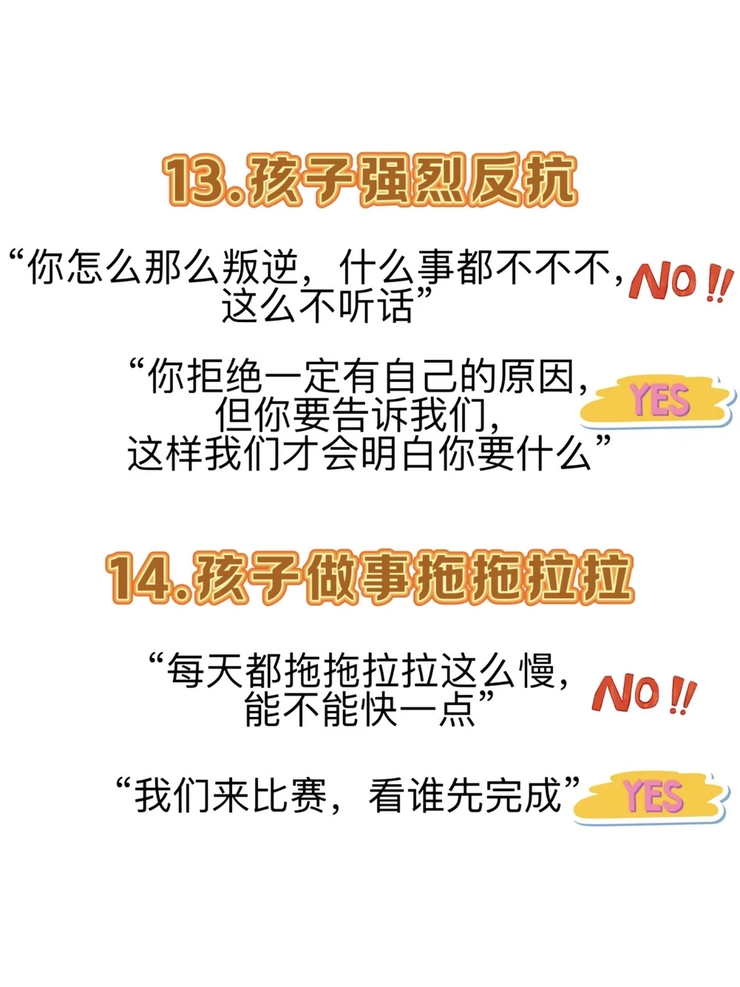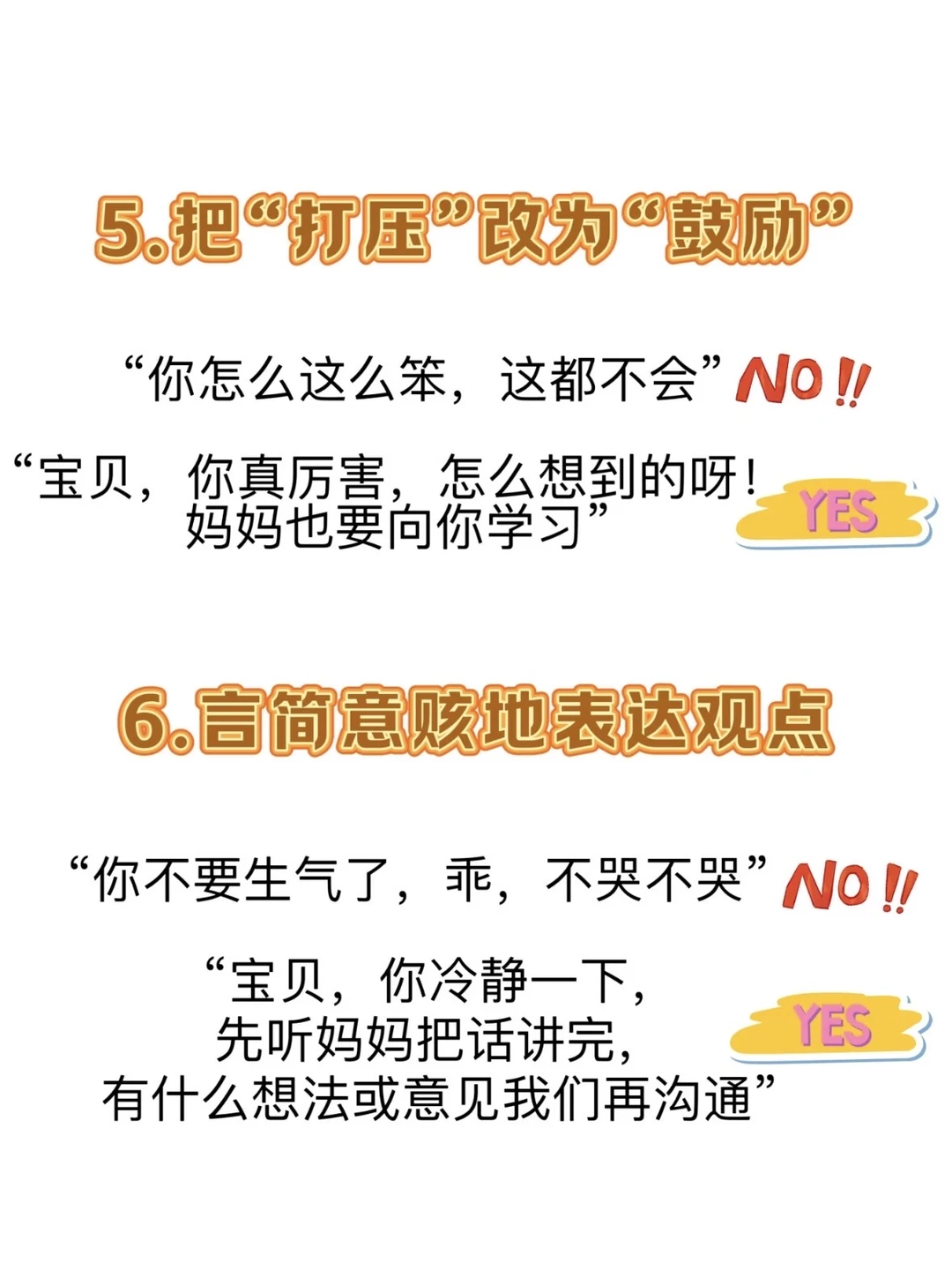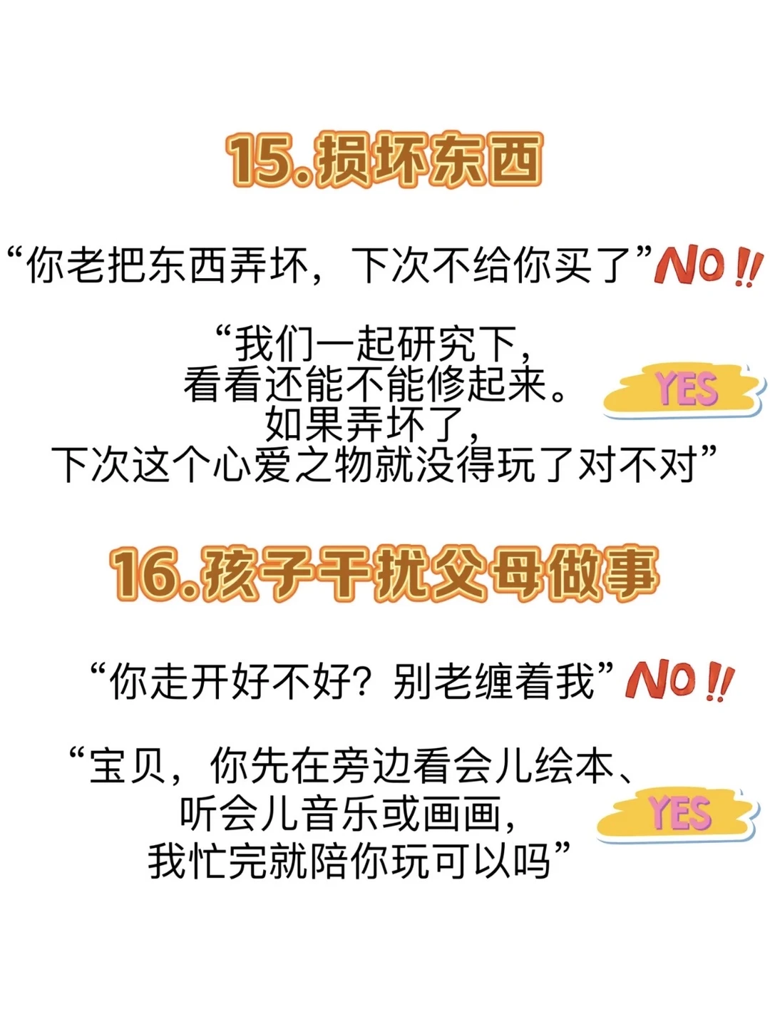 以下是一些父母应该避免给孩子的暗示,以及更积极的沟通方式: 1️⃣把“不”改成“要” ❌示范: “不要大吼大叫” ✅示范: “要小声一点” · 2️⃣把“消极后果”改成“积极期待” ❌示范: “不吃蔬菜长不高” ✅示范: “多吃蔬菜,像大力水手一样,又高又壮” · 3️⃣把“命令”改成“选择” ❌示范: “马上把电视关掉” ✅示范: “你想妈妈陪你玩玩具,还是一起画画?” · 4️⃣把“立刻禁止”改成“提前约定” ❌示范: “别玩了,要回家了” ✅示范: “再玩十分钟,我们就回家,我定好闹钟,闹钟一响就回家” · 5️⃣把“攻击人格”改成“鼓励优点” ❌示范: “你怎么这么笨?” ✅示范: “宝贝真努力,再试试看” · 6️⃣直接告诉他怎么做 ❌示范: “不要顶嘴” ✅示范: “先听妈妈说完” · 7️⃣遇到事情冷静处理 ❌示范: “不要哭了” ✅示范: “妈妈抱抱,告诉妈妈,为什么难过?” · 8️⃣乱扔玩具 ❌示范: “不要乱扔玩具” ✅示范: “如果你不想玩,就把它放好,扔它会疼的” · 9️⃣打人 ❌示范: “不要打人” ✅示范: “你可以生气发脾气,这没关系,但打人是不对的” · 🔟睡觉 ❌示范: “你到底睡不睡,不睡就给我出去” ✅示范: “不睡可以,但是不可以发出声音” · 1️⃣1️⃣分享 ❌示范: “你别总是自己玩,要跟他人分享” ✅示范: “要不你来选一个给他们玩,好不好?” · 1️⃣2️⃣吃饭 ❌示范: “你吃饭就好好吃,能不能不要玩” ✅示范: “到时间就要收碗了,再不吃就要饿肚子” · 1️⃣3️⃣当孩子任性说“不”时 ❌示范: “你这孩子怎么这么倔?我是为你好,你要听话” ✅示范: “你可以说不,但我想听理由,这样我才能理解你,对吗?” · 1️⃣4️⃣当孩子出门磨蹭时 ❌示范: “快点要迟到了,再拖拉就别去了” ✅示范: “我们比一比看谁出门更快” · 1️⃣5️⃣当孩子弄坏东西时 ❌示范: “你怎么这么不小心?下次不给你买了” ✅示范: “没事,下次就知道不这么做了,我们看看能不能修好” · 1️⃣6️⃣当孩子经常过来打扰你 ❌示范: “你怎么这么烦人?就不能安静一会儿” ✅示范: “你先自己玩会儿,妈妈忙完马上找你” · 辣妈育儿经亲子教育正面管教慢育儿我的育儿高光时刻