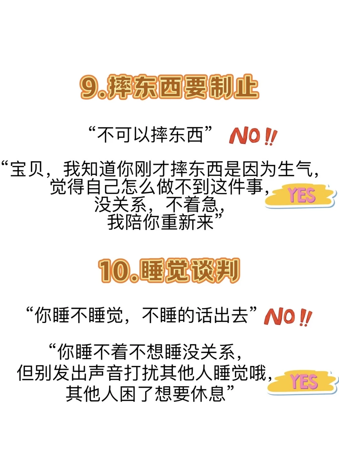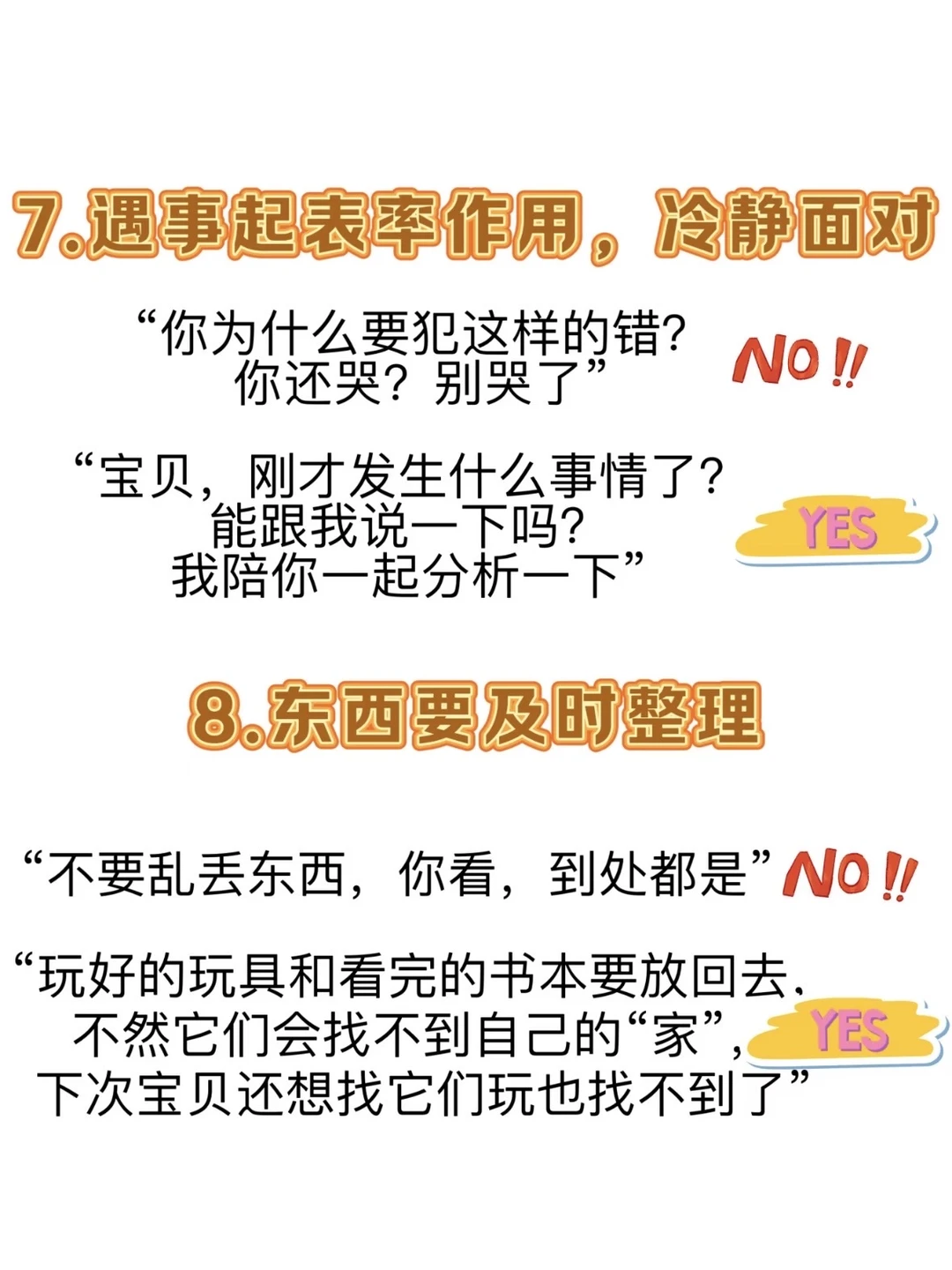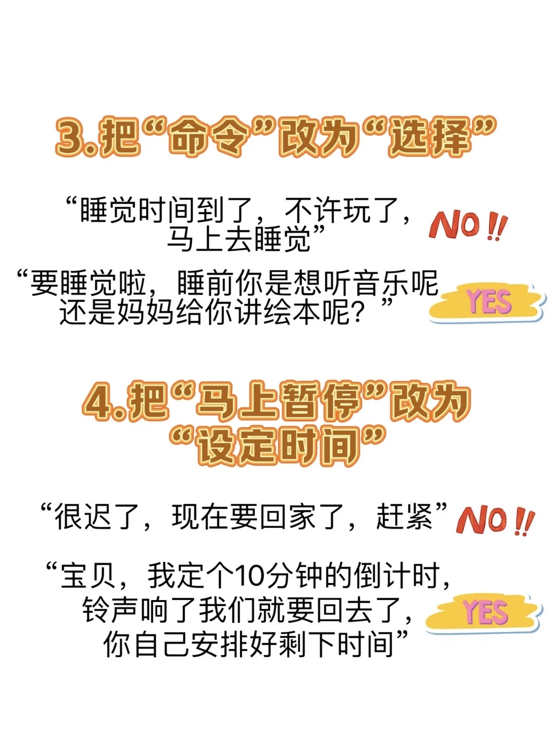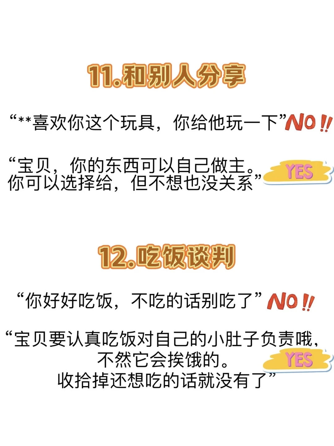 以下是一些父母应该避免给孩子的暗示,以及更积极的沟通方式: 1️⃣把“不”改成“要” ❌示范: “不要大吼大叫” ✅示范: “要小声一点” · 2️⃣把“消极后果”改成“积极期待” ❌示范: “不吃蔬菜长不高” ✅示范: “多吃蔬菜,像大力水手一样,又高又壮” · 3️⃣把“命令”改成“选择” ❌示范: “马上把电视关掉” ✅示范: “你想妈妈陪你玩玩具,还是一起画画?” · 4️⃣把“立刻禁止”改成“提前约定” ❌示范: “别玩了,要回家了” ✅示范: “再玩十分钟,我们就回家,我定好闹钟,闹钟一响就回家” · 5️⃣把“攻击人格”改成“鼓励优点” ❌示范: “你怎么这么笨?” ✅示范: “宝贝真努力,再试试看” · 6️⃣直接告诉他怎么做 ❌示范: “不要顶嘴” ✅示范: “先听妈妈说完” · 7️⃣遇到事情冷静处理 ❌示范: “不要哭了” ✅示范: “妈妈抱抱,告诉妈妈,为什么难过?” · 8️⃣乱扔玩具 ❌示范: “不要乱扔玩具” ✅示范: “如果你不想玩,就把它放好,扔它会疼的” · 9️⃣打人 ❌示范: “不要打人” ✅示范: “你可以生气发脾气,这没关系,但打人是不对的” · 🔟睡觉 ❌示范: “你到底睡不睡,不睡就给我出去” ✅示范: “不睡可以,但是不可以发出声音” · 1️⃣1️⃣分享 ❌示范: “你别总是自己玩,要跟他人分享” ✅示范: “要不你来选一个给他们玩,好不好?” · 1️⃣2️⃣吃饭 ❌示范: “你吃饭就好好吃,能不能不要玩” ✅示范: “到时间就要收碗了,再不吃就要饿肚子” · 1️⃣3️⃣当孩子任性说“不”时 ❌示范: “你这孩子怎么这么倔?我是为你好,你要听话” ✅示范: “你可以说不,但我想听理由,这样我才能理解你,对吗?” · 1️⃣4️⃣当孩子出门磨蹭时 ❌示范: “快点要迟到了,再拖拉就别去了” ✅示范: “我们比一比看谁出门更快” · 1️⃣5️⃣当孩子弄坏东西时 ❌示范: “你怎么这么不小心?下次不给你买了” ✅示范: “没事,下次就知道不这么做了,我们看看能不能修好” · 1️⃣6️⃣当孩子经常过来打扰你 ❌示范: “你怎么这么烦人?就不能安静一会儿” ✅示范: “你先自己玩会儿,妈妈忙完马上找你” · 辣妈育儿经亲子教育正面管教慢育儿我的育儿高光时刻