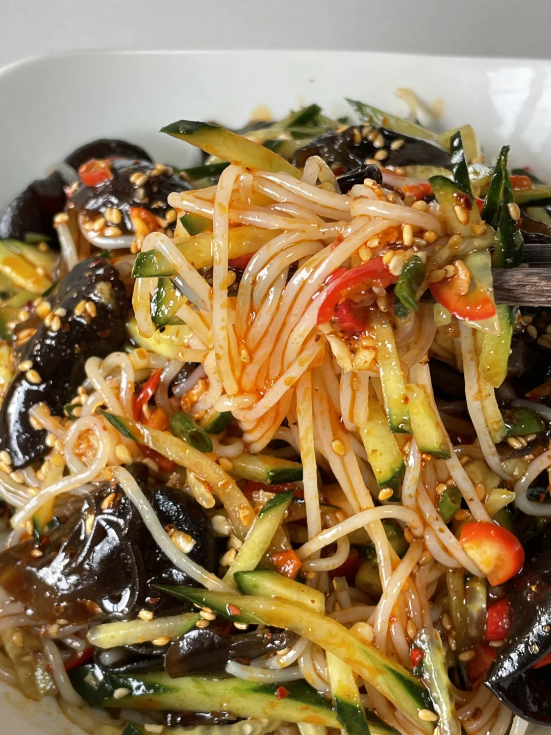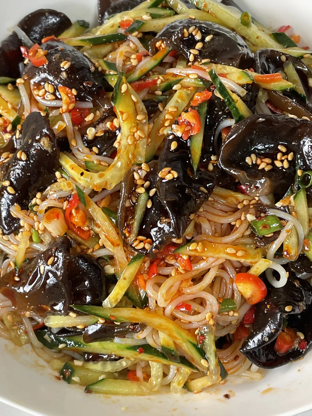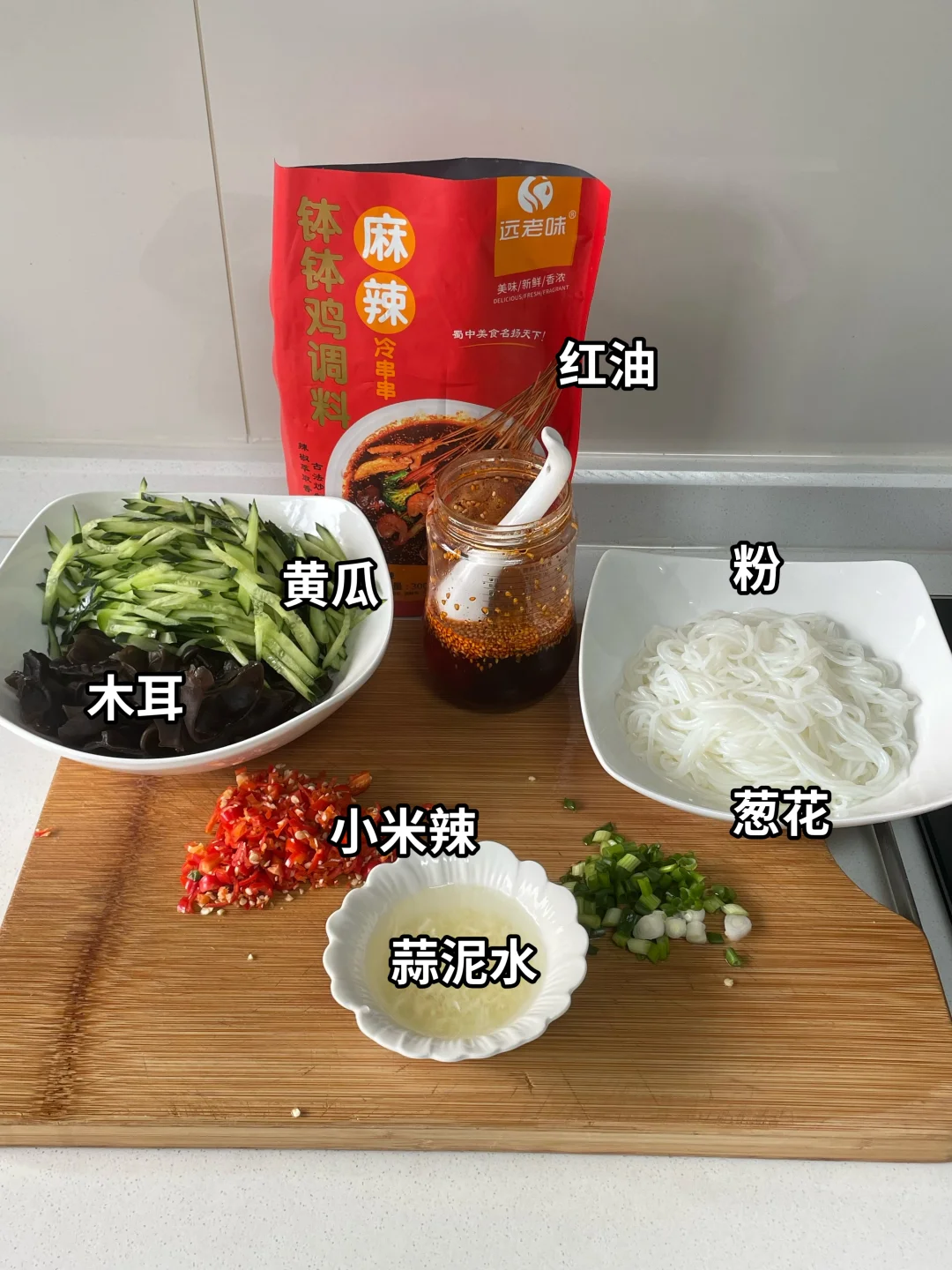 姐妹们,成都这两天真的有点燥热,然后今天拌了个凉拌粉丝,一口下去,酸辣开胃真的巨好吃,喜欢的姐妹可以尝试做一下。 🌶️食材:木耳,黄瓜,粉丝 👩🍳做法: 1⃣️木耳焯水煮熟备用,粉丝煮熟过凉水备用。黄瓜切丝。再切入一些小米辣,蒜泥,葱花。 2⃣️将所有的食材准备好,都放入碗中,加入两勺远老味钵钵鸡调料当红油,这真不是广,姐妹们,这个红油在我这儿出现的次数,老粉们应该知道。再放入1勺生抽,1勺醋,适量的鸡精,盐,花椒粉拌匀即可。这样做出来的凉拌粉丝真的巨好吃,喜欢的姐妹试试吧