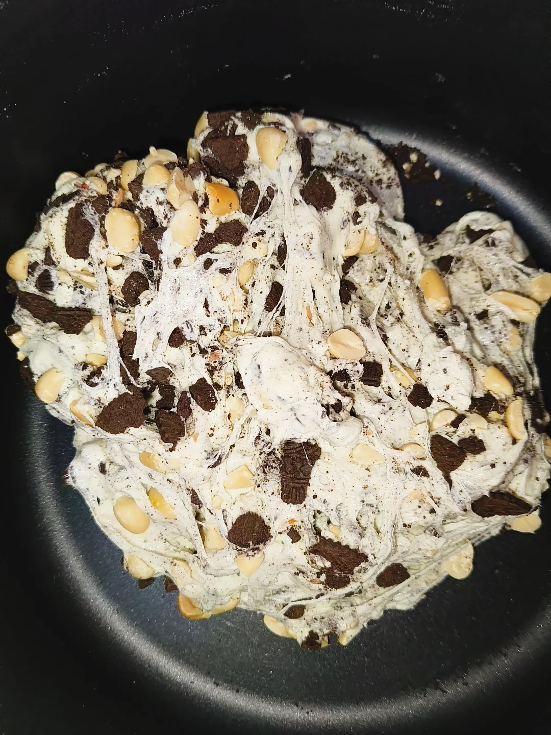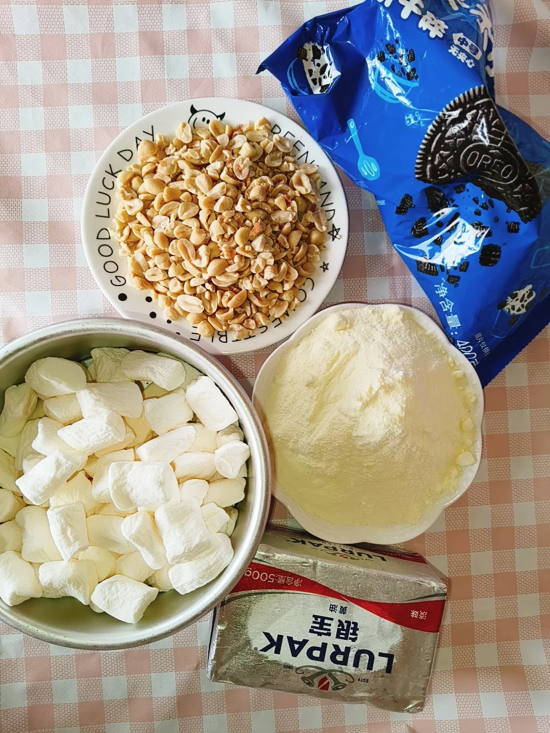 超市逛一圈,发现糖里边添加剂也不少,还是继续自己做吧。 配料:棉花糖250g,黄油30g,奶粉135g,奥利奥110g,花生碎80g 做法: 1.炉子开小火,不粘锅加热融化黄油。 2.倒入棉花糖搅拌融化。 3.加入奶粉搅拌均匀。 4 .关火,倒入奥利奥碎和花生碎,搅拌均匀。 5 .模具铺油纸,把炒好的牛轧糖放在油纸上,晾凉。 6.晾好的牛轧糖,切块,装袋,密封。