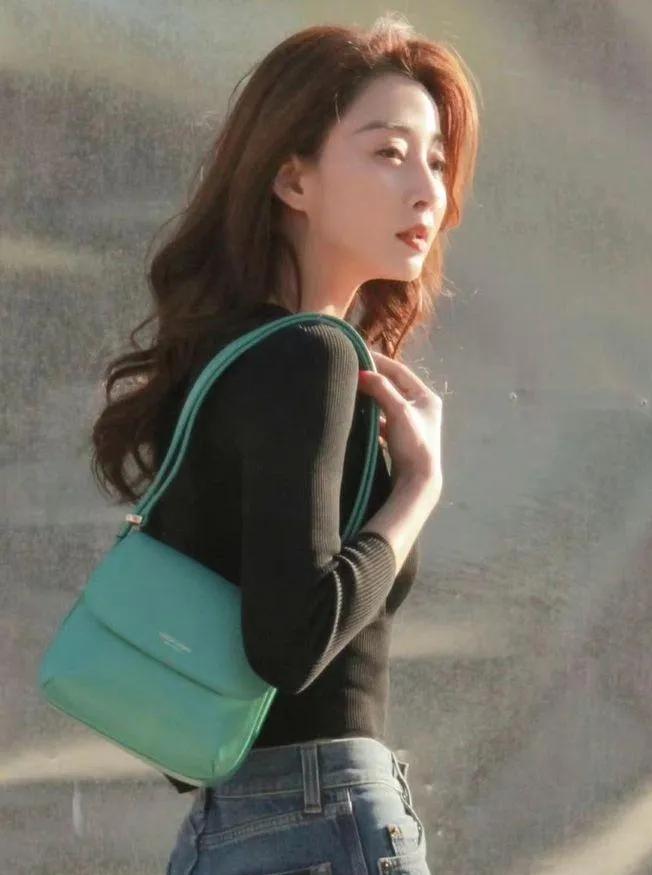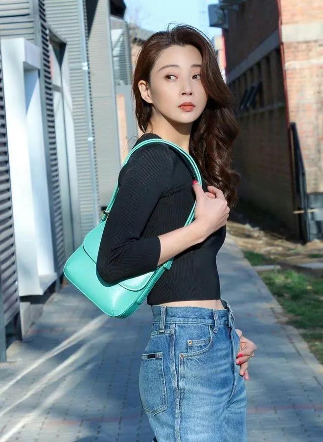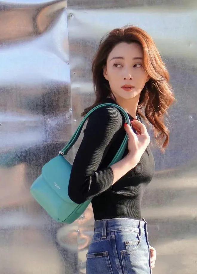 殷桃这波“大回春”赢麻了!💚 波纹卷发+黑色短款针织衫+高腰牛仔裤, 薄荷绿腋下包直接点亮全身, 休闲风也能穿出高级感, 这状态谁看了不喊一声姐姐好绝! 殷桃 明星穿搭 波纹卷发
