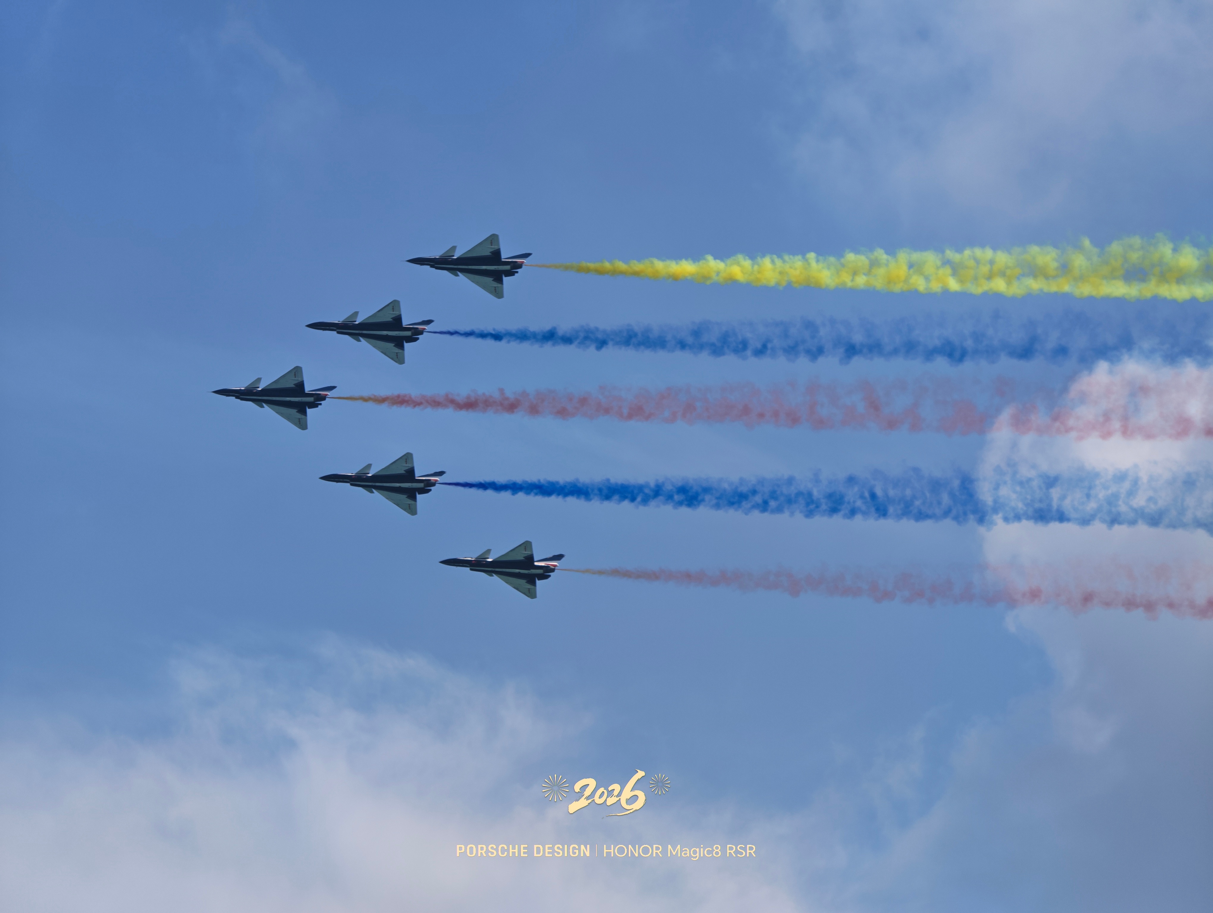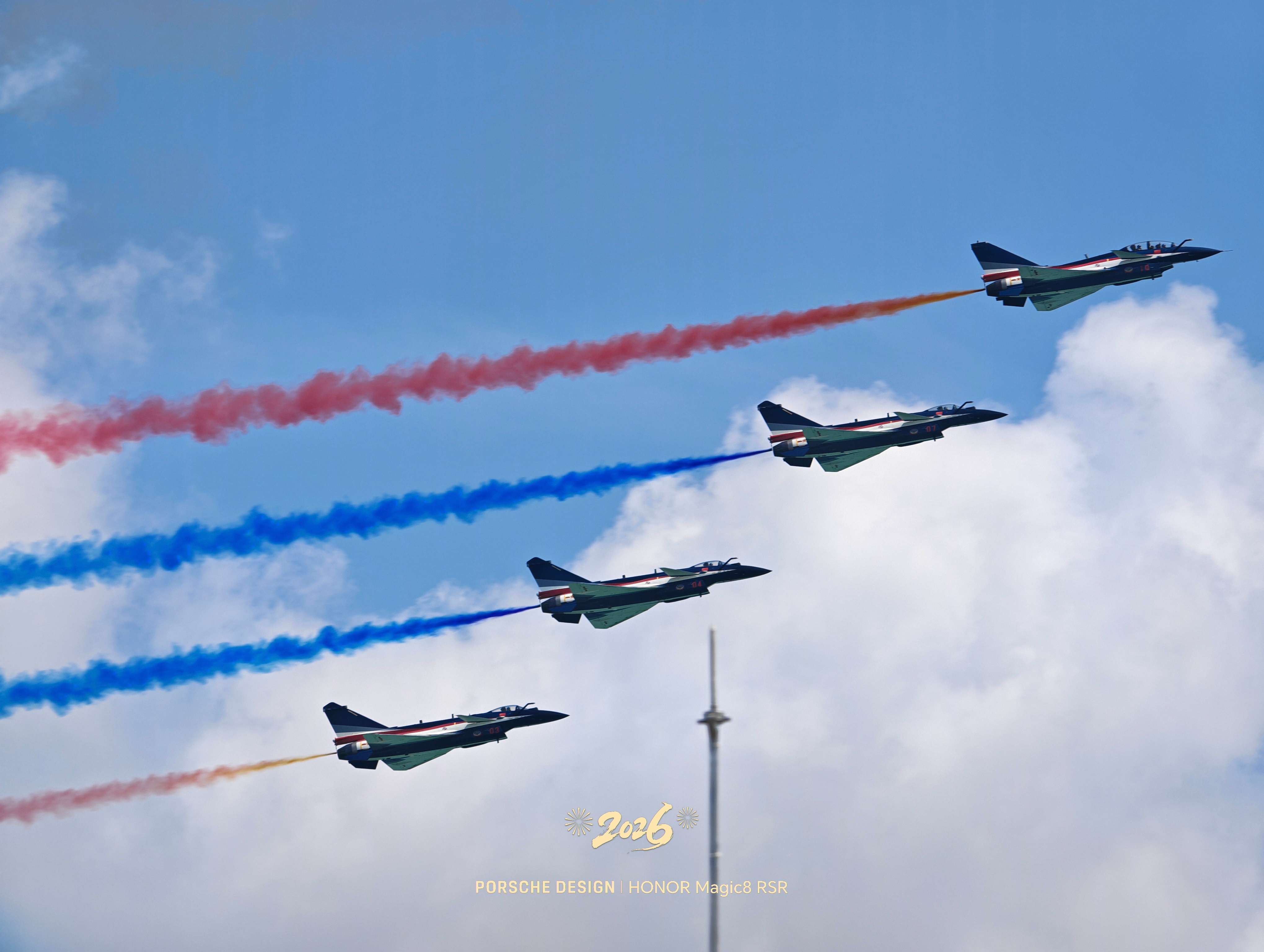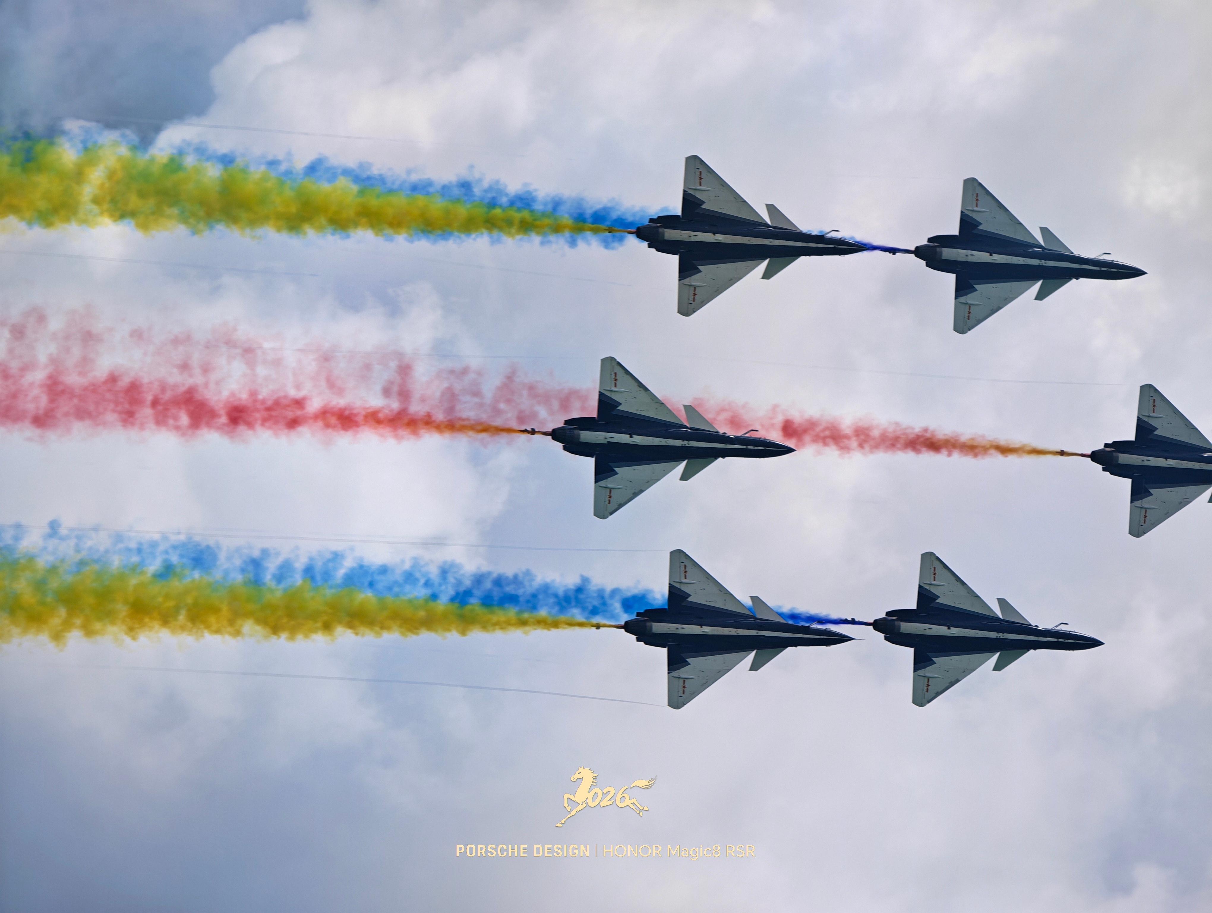 早上在航展现场拍了一圈,荣耀Magic8 RSR保时捷设计的表现确实超出我的预期。八一飞行表演队的J-10C还在远处空中盘旋时,在增距镜的帮助下,取景框里已经能看清战机的轮廓。