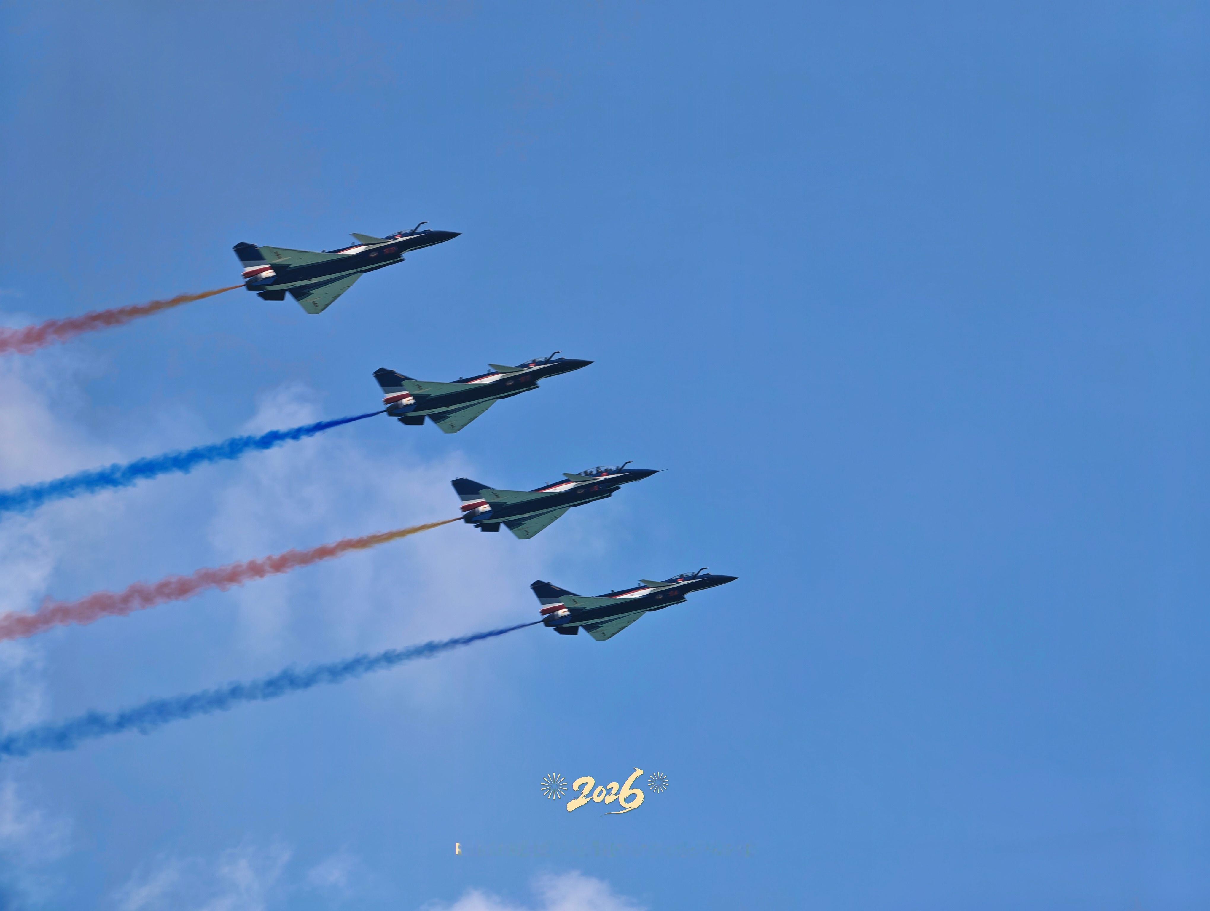 在荣耀Magic8 RSR和增距镜的配合下,轻松记录下了六架J-10C拉出的长长彩烟,像一支巨笔在新加坡蓝天中挥洒。飞机的外形和每一次飞行细节,都能用荣耀Magic8 RSR清晰、完整地捕捉下来。