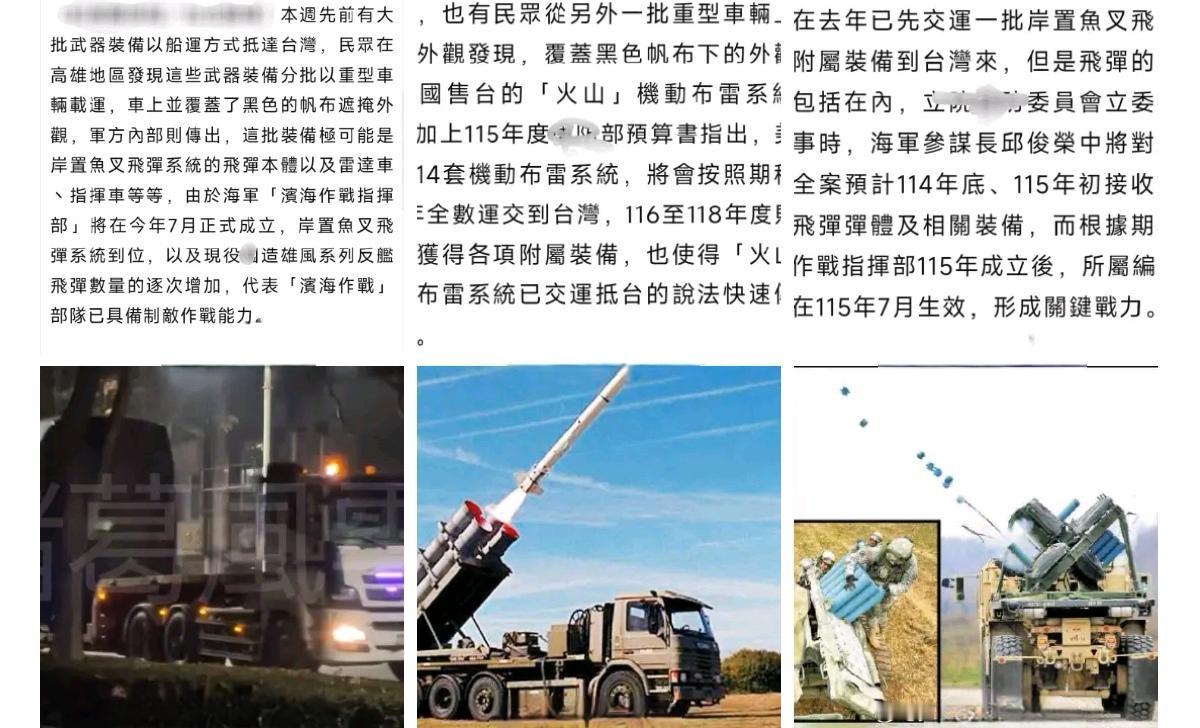 未经证实的消息称,一批美制售台武器已于本周低调抵达高雄港,其中可能包括“鱼叉”机动岸舰导弹系统的雷达车与导弹等,还可能包括“火山”机动布雷系统。 图3,该批武器的交付日期与此前台伪军官方的预计基本相符。 台伪军总共订购了100套「岸置魚叉飛彈系統」,其中包括400枚RGM-84L-4 Block II(U)导弹、4枚RTM-84L-4训练弹、25辆机动雷达车等装备,总金额达902.40635亿新台币。首批预计于今年7月前形成初始战斗力。 台伪军订购的14套“火山”机动布雷系统预计今年全部交付,2027-2029年交付其他附属设备。