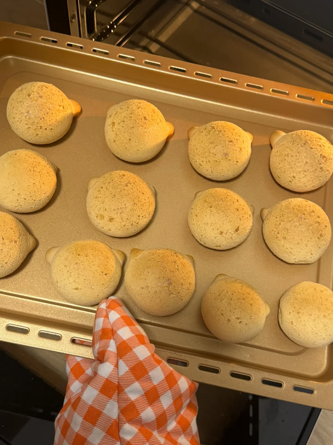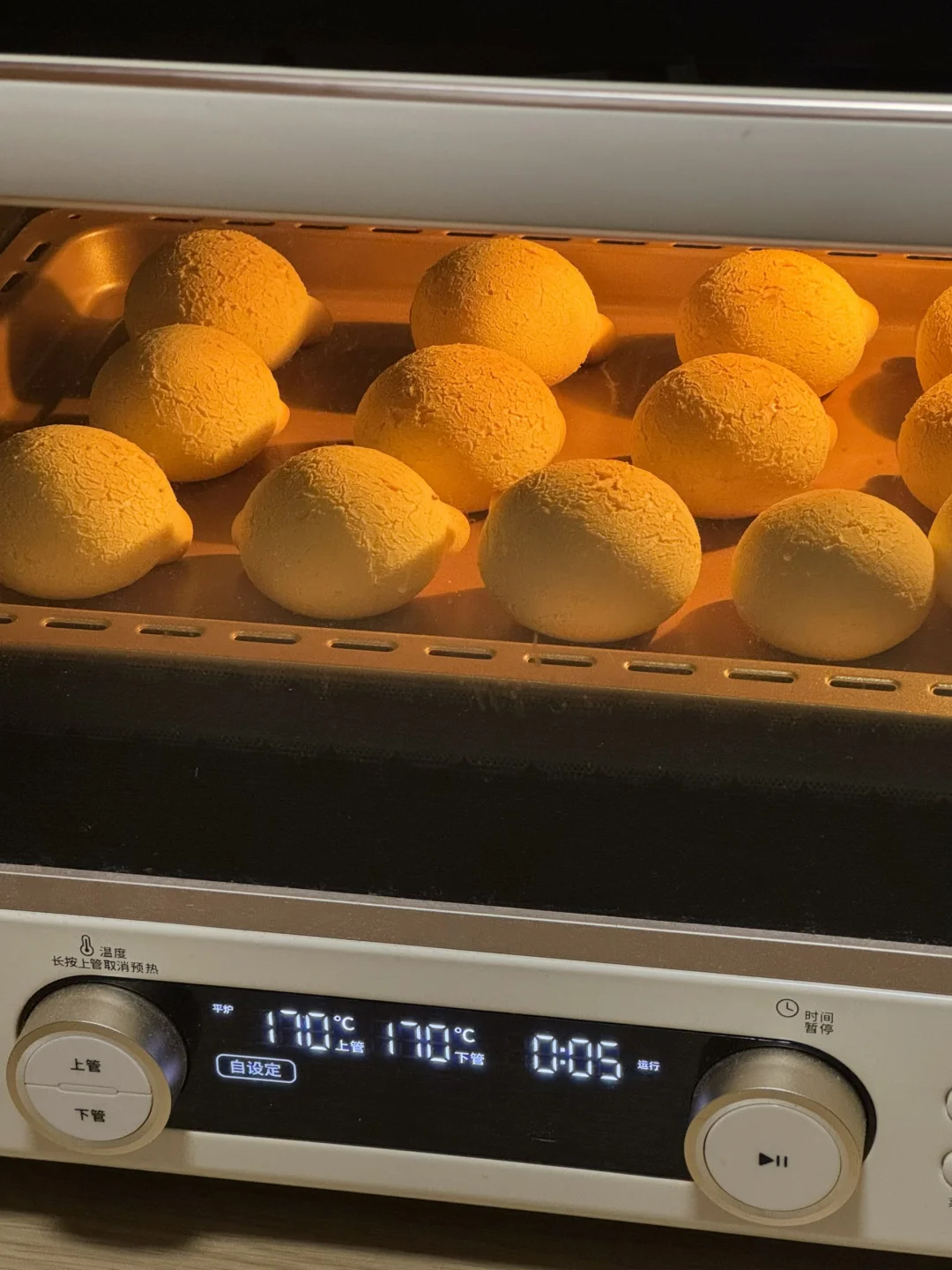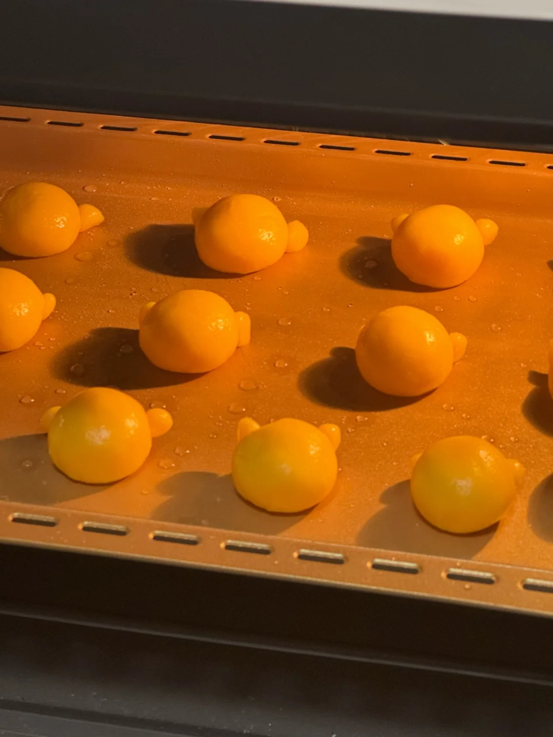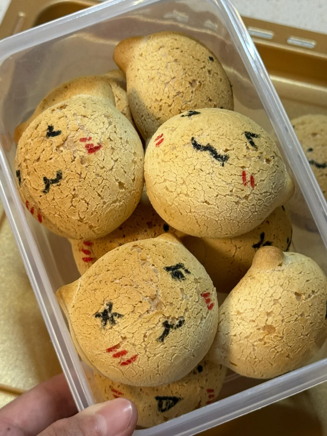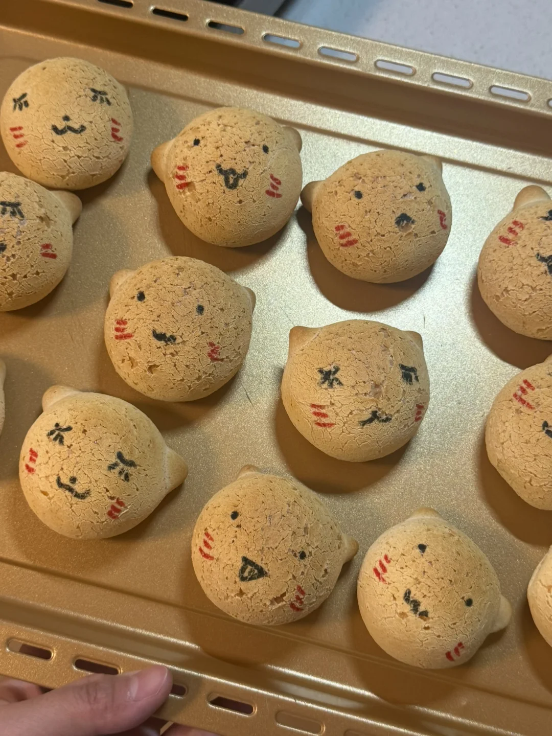 4.捏好后,烤箱预热,烘烤前喷水(防止烘烤的时候裂开)170度烘烤30分钟,再焖5分钟再拿出,晾凉后用可食用马克笔画上表情。