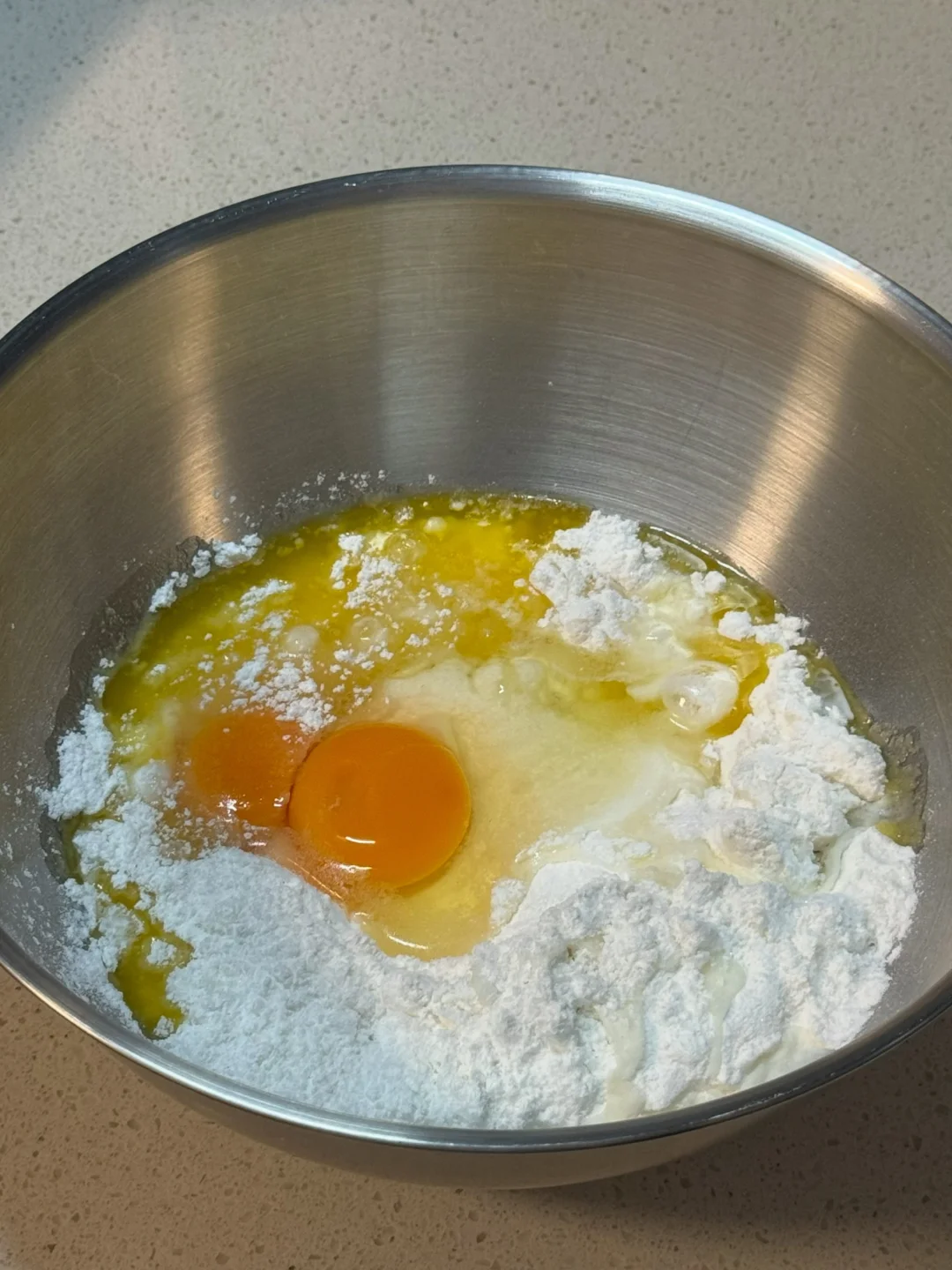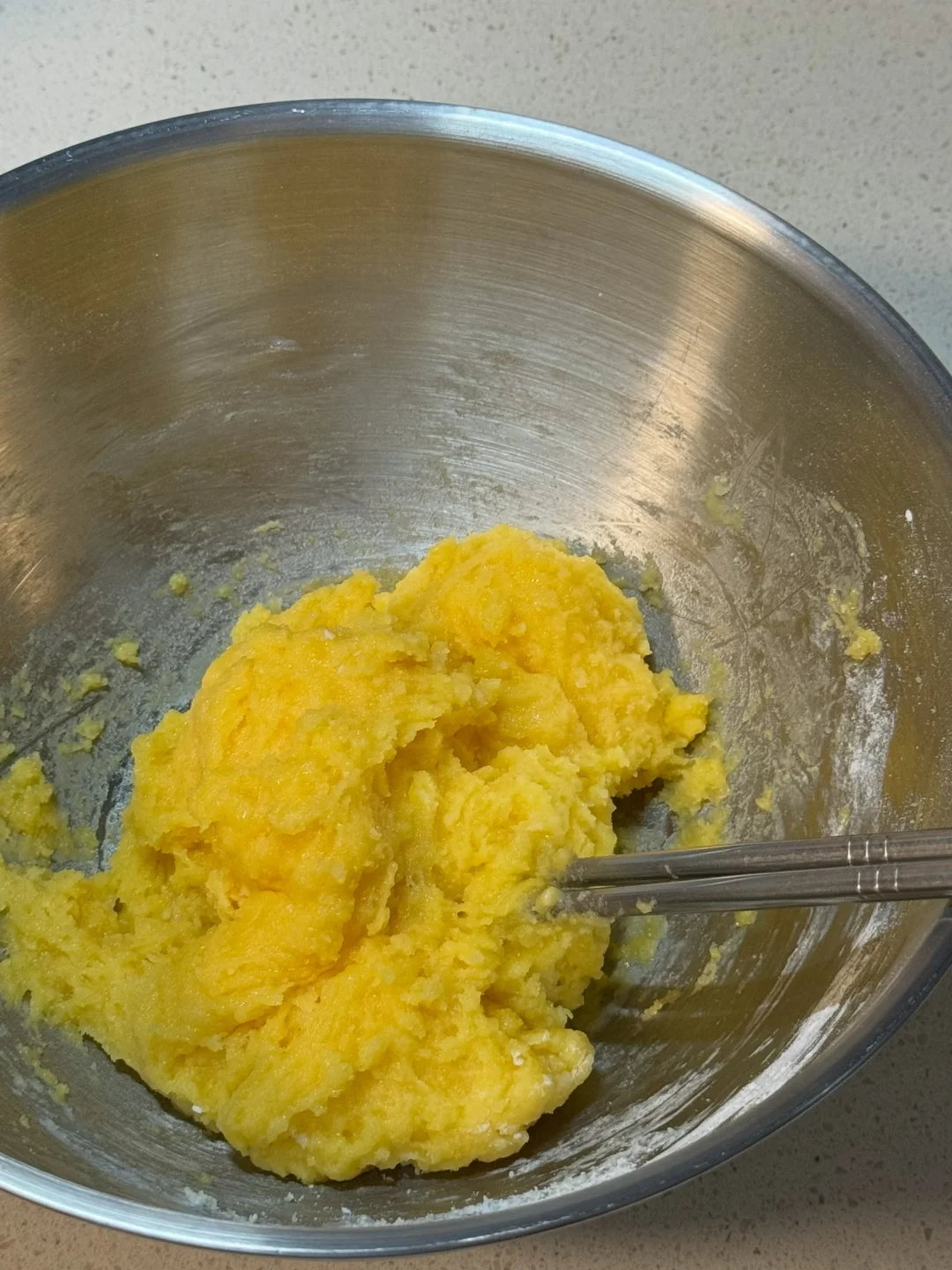 2.食材全部倒入大碗中,用筷子搅拌成絮状,再戴上手套揉至光滑面团(记得一定要戴手套,不然会很粘,揉5分钟左右)