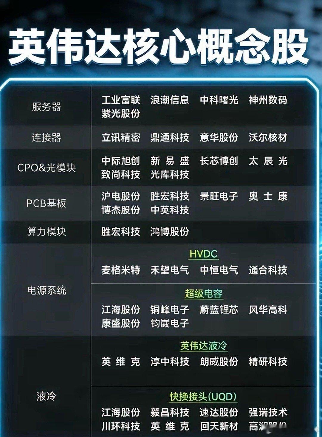 英伟达核心概念股:一、AI服务器整机/代工(最直接受益)1. 工业富联(601138)英伟达AI服务器全球独家代工厂,承接Blackwell/GB300整机制造,订单排至2026年,单机价值量最高,业绩弹性最大。2. 浪潮信息(000977)国内AI服务器龙头,与英伟达深度合作,基于H200/B200芯片的服务器放量,国产算力核心标的。3. 紫光股份(000938)新华三主体,英伟达认证服务器供应商,算力网络+AI整机双驱动,海外订单增长。二、光模块/光器件(算力互联核心)4. 中际旭创(300308)全球光模块绝对龙头,英伟达800G/1.6T核心供应商,1.6T硅光模块送样认证,订单排至2026Q4,份额与技术双壁垒。5. 天孚通信(300394)光引擎/FAU封装核心,英伟达800G光引擎国内唯一供应商,CPO前沿布局,AI收入占比持续提升。6. 新易盛(300502)800G/1.6T批量交付,北美云厂+英伟达订单饱满,海外份额领先,业绩高增确定性强。三、PCB/高速材料(算力硬件底座)7. 胜宏科技(300476)英伟达AI服务器PCB算力板核心,GB300 OAM模块5阶HDI板独家,单机价值量高,份额近50%。8. 沪电股份(002463)北美AI服务器GPU主板市占率超80%,英伟达GB300高端PCB主力,技术壁垒深厚。9. 生益科技(600183)AI服务器超低损耗覆铜板(M9级)核心供应商,高速材料全球龙头,英伟达PCB基材主力。10. 菲利华(300395)国产唯一Low-Dk Q布供应商,英伟达高端PCB基材认证,产能锁定至2026年,稀缺性极强。四、液冷散热/电源(算力配套刚需)11. 英维克(002837)英伟达GB300服务器液冷散热独家供应商,浸没式液冷市占率超40%,AI散热需求爆发核心受益。12. 麦格米特(002851)英伟达数据中心高压电源模块龙头,AI服务器电源核心配套,订单随算力扩张放量。13. 铂科新材(300811)GPU电感软磁材料独家供应,金属磁粉芯全球市占第一,直接绑定英伟达芯片性能,不可替代。五、先进封装/测试(芯片制造配套)14. 长电科技(600584)国内封测龙头,英伟达芯片先进封装(CoWoS/Chiplet)核心供应商,订单排至2026年。15. 通富微电(002156)GPU先进封装主力,Chiplet技术突破,英伟达封测订单持续增长。16. 罗博特科(300757)AI芯片/板卡自动化检测设备龙头,英伟达检测订单占比高,先进制造配套刚需。六、算力生态/应用(落地与服务)17. 鸿博股份(002229)与英伟达共建AI创新赋能中心,子公司英博数科独家运营,算力租赁+大模型服务,AI业务占比高。18. 软通动力(301236)英伟达软件生态合作伙伴,AI大模型开发、算力运维服务,深度绑定英伟达生态。