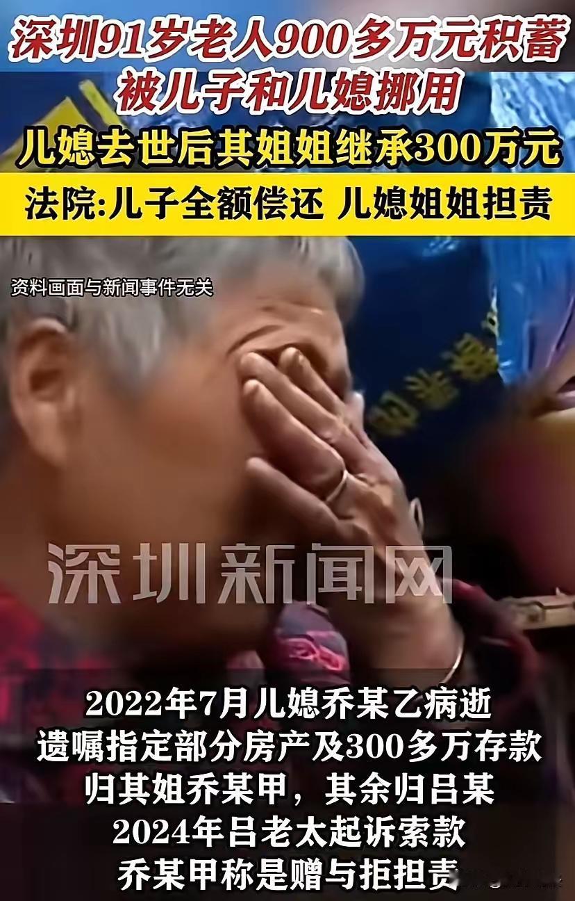 不要低估人性!深圳九旬老太转900万给独子,竟被儿媳遗赠给外人,法院判了! 广东深圳,一位年近九旬的吕老太,老伴早已离世,身边只有一个独子。考虑到自己年事已高、行动不便,想着钱财早晚都是儿子的,便卖掉房产,将900余万元卖房款分批全部转给儿子吕某。 可让她万万没想到的是,儿子收到巨款后,转手就全部转给了妻子乔某。 更过分的是,乔某不仅用这笔钱用于日常开销、偿还夫妻共同房贷、装修房屋,还在2022年7月去世前立下遗嘱,将其中300万元+房产50%产权,全部遗赠给了自己的亲姐姐。 要知道,吕某与乔某2007年结婚,婚后并未生育子女。老人一辈子打拼攒下的养老钱,非但没能保障自己晚年,反而被儿媳擅自处分、留给“外人”,吕老太得知后悲愤交加,多次要求退款无果,最终将儿子吕某、儿媳的姐姐一并告上法庭。 庭审中,吕老太主张案涉款项属于借款,要求返还;儿子吕某对此基本无异议,但儿媳的姐姐坚称:老人转账并非借款、也非保管,而是对儿子的赠与,老人无权要求返还。 这笔900多万,到底是借款、保管,还是赠与?法院结合事实与法律,逐一作出认定。 首先,民间借贷需同时具备借款合意+款项交付两个要件。本案中,吕老太仅有转账记录,未能提供借条、聊天记录等证明双方存在借贷合意的证据,因此法院未认定为借款。 其次,关于赠与与委托保管的认定。法院认为,案涉900余万元是老人卖房所得、毕生积蓄,结合其高龄、行动不便、与儿子共同生活、依赖钱款安度晚年的客观事实,若直接认定为赠与,对老人明显不公。 从常理与生活逻辑判断,老人将钱款交给儿子,目的是委托保管、保障自身晚年生活,而非无偿赠与。 再次,根据《民法典》第1064条,夫妻一方在婚姻关系存续期间,将钱款用于家庭日常生活、共同房贷、房屋装修等,属于夫妻共同生活开支,相应返还义务应由吕某与乔某共同承担。 最后,依据《民法典》第1161条,继承人应在继承遗产的实际价值范围内,清偿被继承人的债务。乔某的姐姐作为遗嘱继承人,需在继承乔某遗产的范围内,承担连带清偿责任。 综上,法院最终判决:儿子吕某向吕老太返还900余万元,乔某的姐姐在继承遗产范围内共同承担清偿责任。 此案令人唏嘘,也给所有老年人敲响警钟:人性经不起试探,养老钱千万不要过早、全额交给子女。即便要提前安排财产,也务必守住自己的养老底线,写清协议、明确性质,不是防备亲人,而是守住晚年尊严,尊重现实人性。 这件事你怎么看?欢迎在评论区留言讨论。 关注@安律说法 案例中看人生百态,法律中寻破局之法!