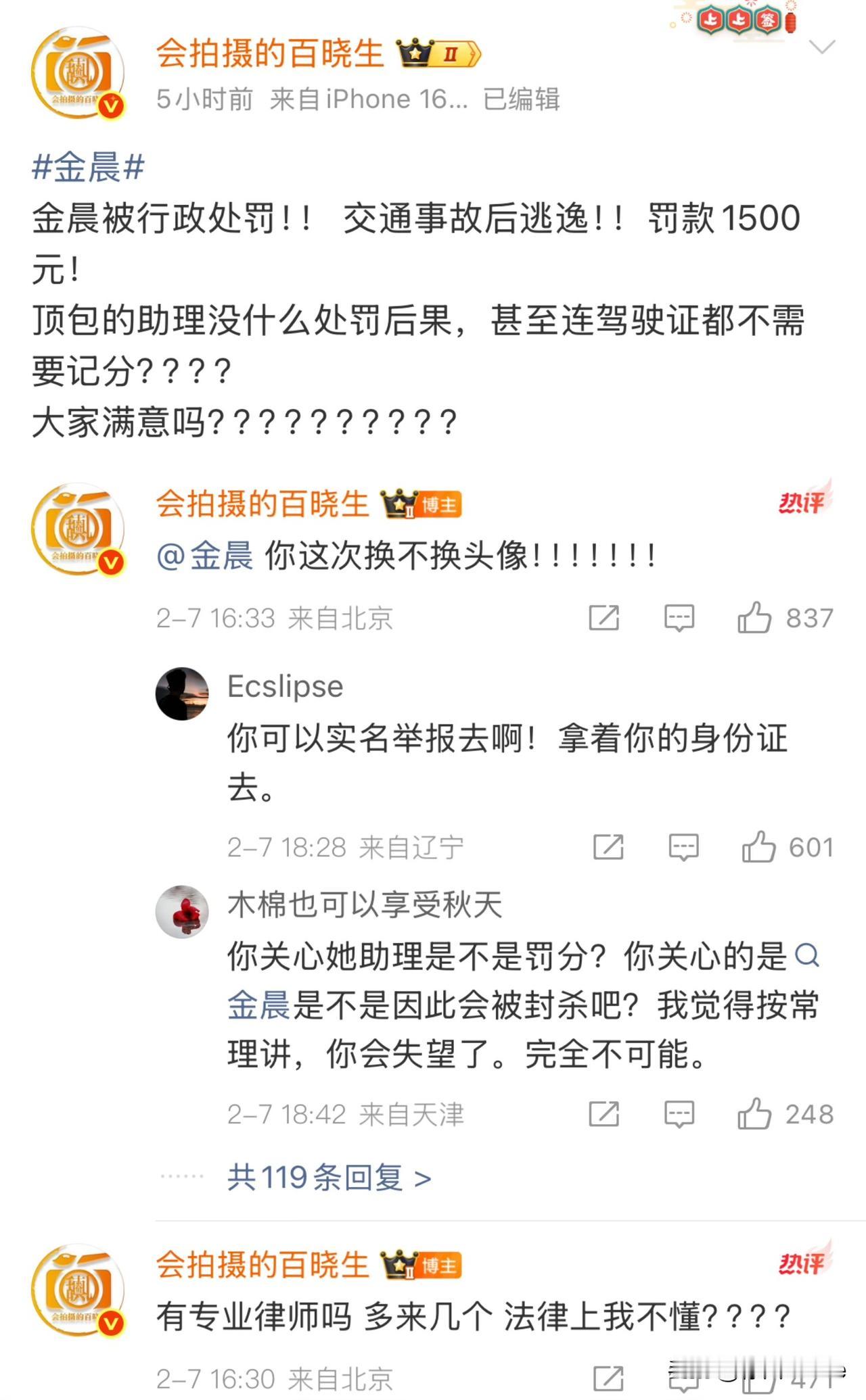 2月7日,娱记不满金晨处理结果,质疑金晨顶包助理没有后续,网友找到多起类似事件,发现普通人涉及顶包,2000➕15天,金晨涉及顶包1500,被网友质疑艺人特权! 之前或许大家只是把这件事当一件平常的小事,普通人也偶尔会有的失误,原谅金晨的行为,现在大家发现同样的事,金晨的处理结果跟普通人不同,这就有意见了,凭什么金晨不用进去?明明是一样的事,同人就是2000➕15天,金晨就是1500,凭什么?凭她是艺人,有特权么? 特权两个字一出,金晨口碑路人缘最少掉一半,因为大众最反感的就是普通人与高收入人群之间不公平的待遇!金晨刚好触底了