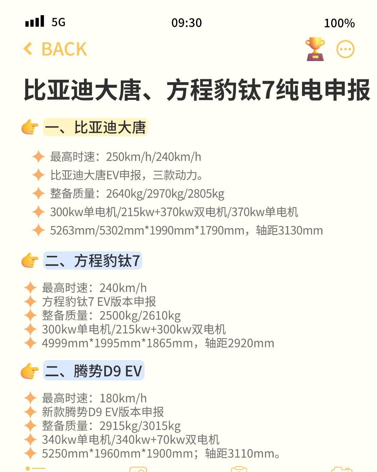工信部最近一期的新车名单里,三款纯电SUV的申报信息直接引爆了话题。这已经不是简单的新车申报,是比亚迪正在给各个细分市场的对手们重新划跑道。 大唐一上来就把尺寸定在了车长超过5.3米、轴距3米13的级别。这已经不是对标,是直接越级建立了新的空间标准。 更关键的是它的动力,顶配版本前后电机加起来585kW,这差不多是800匹马力。一台主打家用的七座SUV给出这个数据,明摆着连性能车的饭碗都要碰一碰。 方程豹钛7的纯电版,双电机综合功率干到了515kW。这个数字已经超过了它自家插混四驱版的数据,纯电的瞬间爆发力,注定会让它在起步和越野脱困时更猛。 但这也带来了最直接的挑战。超过2.6吨的车重,配上硬派造型的高风阻,对电池是巨大的考验。续航数据现在捂着没公布,恰恰是厂家心里最没底的地方。 仔细看这次的申报车型,会发现一个清晰的策略。大唐用尺寸和马力抢占高端家庭用户,钛7纯电用性能巩固硬派风格,腾势D9 EV则继续稳住商务MPV的份额。这不是乱拳出击,是精准的三路包抄。 这种打法,隔壁的理想L9、小鹏GX和魏牌V9X立刻就能感受到压力。大家都在卷三排座大空间,但比亚迪这次把电机的功率卷到了一个让后来者很难跟的新高度。 尤其要注意的是激光雷达在这几款新车上的普及。从这次申报看,它已经不是顶配的装饰品,正在变成中高端车型的准标配。智驾能力的军备竞赛,成本门槛被迅速拉低。 对于正在看车的用户来说,这波新车潮直接制造了选择焦虑。是等大唐这种全能选手,还是冲钛7纯电的个性玩法,或者看看其他品牌如何应对降价?至少半年内,20万以上的新能源车市场,价格和配置的变动会异常频繁。 比亚迪这次密集申报纯电车型,信号非常明确。混动市场站稳后,纯电领域的全面进攻号角已经吹响,而且是从动力性能这个最硬的指标开始碾压。接下来的半年,我们会看到一场围绕“马力”和“度电成本”展开的新一轮技术厮杀。