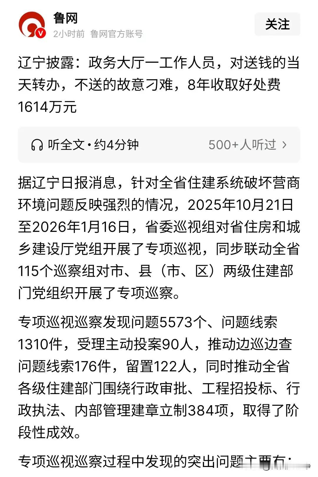 就这种新闻,真的让人大跌眼镜。一个政务大厅窗口的办事人员,就能收这么多钱吗? 8年收了1,614万?就他一个人,真的就是他一个人分的吗? 如果政务大厅窗口办事员都有这么大的权力,那么它后面的领导权力的有多大呀? 而更可悲的是,这么多企业居然默认了这种潜规则 像这种新闻越来越多,你说谁还敢去东北投资呢? 其实说到底就一句话,他们知道这不是杀头的罪过 国家再怎么抄,也不可能把全部的钱都抄走 他去坐牢呗,然后偷着再藏一部分,等出了监狱之后,照样吃香的喝辣的 实话实说,没有严刑峻法,你刹不住这股歪风邪气 这些人早就不害怕坐牢了