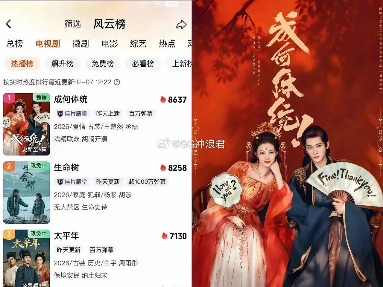 不仅胡歌和杨紫没有想到白宇和周雨彤也没有想到王楚然和丞磊主演的《成何体统》刚开播,就直接把他们俩的剧给碾压了!开播首日站内热度就冲到了7891,第二天更是突破8600,硬生生把杨紫、胡歌主演的《生命树》和白宇、周雨彤主演的《太平年》都甩在了身后。这部剧能爆火不是没道理。它改编自高分小说,讲的是现代社畜穿越成“妖妃”,和同样是穿越者的“暴君”皇帝在古代“随地大小演”的爆笑故事。王楚然和丞磊这对“疯王妖妃”CP,一个娇憨美艳,一个腹黑傲娇,化学反应直接拉满,弹幕全是“锁死”的呼声。更狠的是,剧方首更6集,后续每日连更,这种“不水剧情”的操作,让观众追得根本停不下来。在大家都在吐槽古偶套路化的时候,《成何体统》用反套路的剧情和密集的笑点,证明了只要内容够扎实,古偶依然能打。看来这个春节档,大家的遥控器要被这部黑马剧承包了