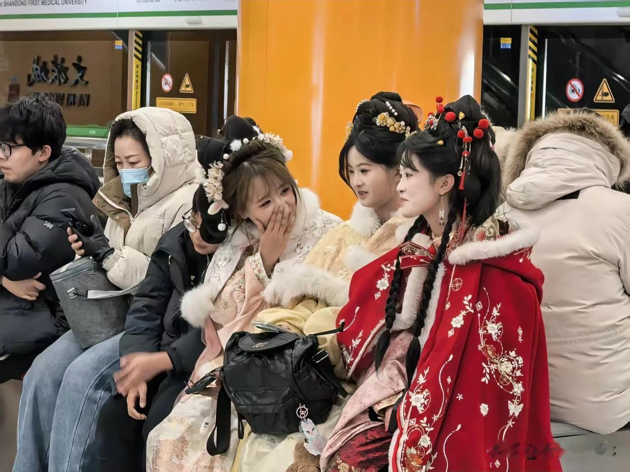 下面是我2026年2月7日晚上在济南地铁拍的照片,三位大学生美女穿戴别致,全是古装,由于不便透露,感觉应该是表演系的学生,可能出去表演节目了!在地铁上别有一番风味!济南照片 地铁自拍女