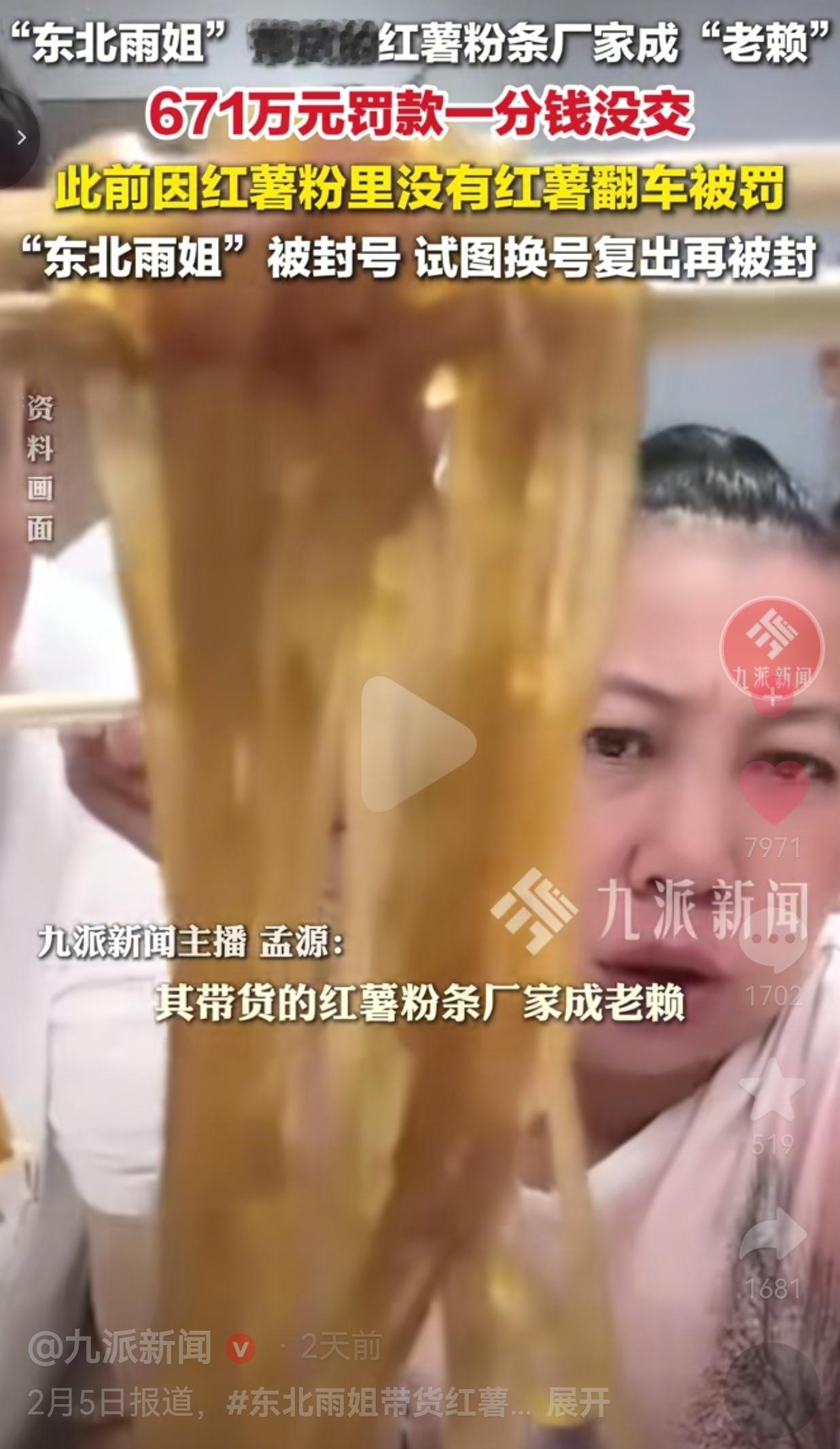 东北雨姐彻底凉了!去年,她在直播间卖的粉条里被检查出来没有红薯,只有木薯,事情曝光出来之后,市监局对商家做出了罚款671万的决定,结果,罚款一分没交,彻底成为了老赖。这对东北雨姐是一个致命的打击。 大家还记得东北雨姐吗?那个一口大碴子味、在直播间里豪爽啃着苞米、拍着胸脯跟直播间的老铁保证,结果,就这么“凉”了。 她翻车的原因,说起来都是没有底线造成的,这么大一个网红,竟然做这种事情。 2024年12月,她在直播间里力推的“纯红薯粉条”,被查出来里面既没有红薯,也没有木薯,就是一堆廉价的玉米粉做的。这不是把咱们当傻子耍吗? 更让人气愤的是,生产这粉条的辽宁朝阳县六河粉条制造有限公司,去年早就被市场监管部门罚了671.76万元。 可人家就是硬气,直到今日,这笔罚款还是一分钱都没交,直接成了“老赖”,被法院列为失信被执行人,涉案款项全部未履行。 我就想问一句,这到底是谁的错? 我想厂家肯定是罪魁祸首。为了赚黑心钱,什么缺德事都干得出来。但雨姐作为拥有2400多万粉丝的大主播,责任肯定也不会小。 而且,她曾在直播间里拍着胸脯保证“品质杠杠的”,粉丝们冲着你的信任下单,结果收到的是假货。这不是寒了粉丝的心吗? 更让人寒心的是,被封号之后,她不想着弥补错误,取得各位粉丝的原谅,反而她还想换个小号偷偷复出,结果又被平台给封了。 这说明什么?说明她根本没意识到自己错在哪,只想着怎么继续割粉丝韭菜。 后来,平台也明确表态,对“东北雨姐”等劣迹网红,坚决不给任何复出的机会。 我知道很多人喜欢雨姐,觉得她真实、接地气,像个邻家大姐。我也曾经被她的豪爽圈粉过。但是,做错了就是做错了,做不了事情就应该接受惩罚。 通过这件事给我们所有主播都敲响了警钟:在直播间里,你的人设可以演,也可以装作商品销量很好,但是,商品的质量一定要保真。 如果你没有底线,一味地圈钱,可能一时赚的多,但是,肯定走得不稳。等你的丑事一旦被曝光,对你以后的直播事业肯定是致命的。 所以说,还是做一个有良心、有道德底线的网红吧! 对此,你有什么看法呢?