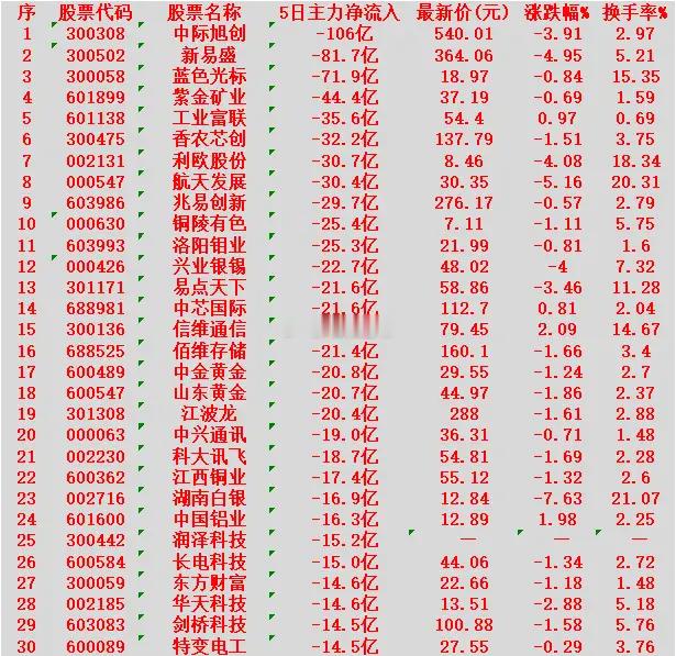中际旭创:5日净流出 106亿元,换手率 2.97%新易盛:5日净流出 81.7亿元,换手率 5.21%蓝色光标:5日净流出 71.9亿元,换手率 15.35%紫金矿业:5日净流出 44.4亿元,换手率 1.59%工业富联:5日净流出 35.6亿元,换手率 0.69%香农芯创:5日净流出 32.2亿元,换手率 3.75%
