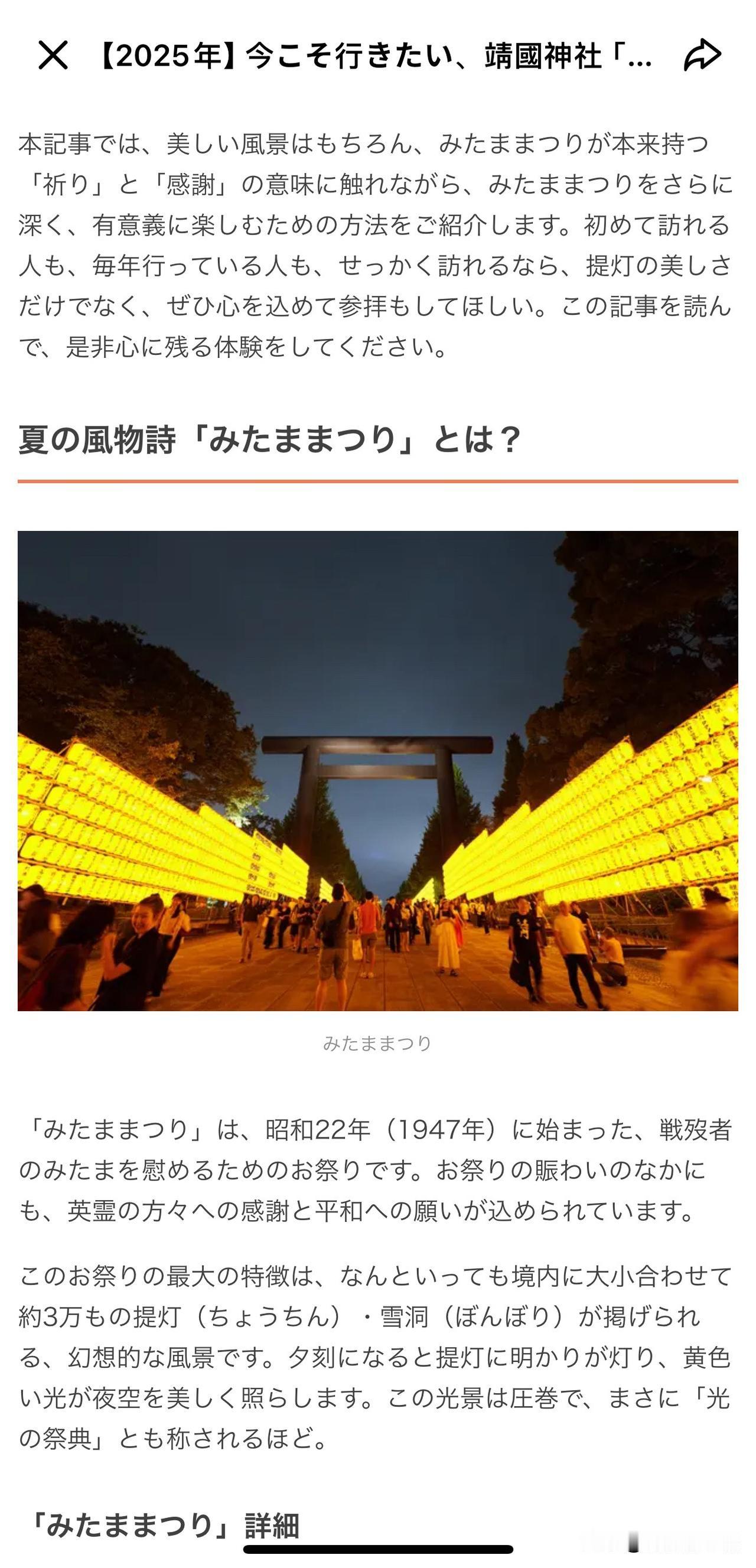 靖国神厕御灵祭与三万黄灯笼 中华上下五千年,每逢佳节都是悬挂大红灯笼,一直找不到历史上逢年遇典有悬挂黄色灯笼的习俗。 本人没有出国的经历,对国外的风俗习惯也不甚了解,好在现在有了互联网,又有了大数据,可以上网搜寻,于是…… 在日本,有一个在中国人看来臭名昭著的靖国神厕,他们有一个重大活动,是用来祭奠那些为日本死去的亡灵,叫“御灵祭”,英文叫“Mitama”。在这个活动中,每一个人都可以花钱买一个灯笼,写上自己的名字和慰灵文字,然后挂在神厕中,用于供奉他们的亡灵。整个神厕可悬挂三万只灯笼。 这个灯笼有一个明显的特点,那就是规定都必须用黄色灯笼,全世界唯一的黄灯笼祭。 日本每届新内阁成立,都会组织去神厕参拜,中国以及二战中受到日本军国主义侵略的国家,都严厉批评和谴责、甚至抗议。但日本政府依然我行我素,屡次做出这种伤害我们的行为。 而时至今日,在日本以外,我们似乎又看到了满街的黄灯笼,但愿与日本无关! ————————