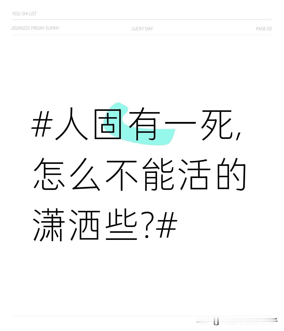 人固有一死,怎么不能活的潇洒些? 人固有一死,当然要活得潇洒些!别被道德绑架束缚,那些懂事的人往往最委屈,会哭会闹的才有糖吃。也别总渴望得到别人理解,伤害你的人心里门清,无需多言。 别在烂人烂事上浪费时间,每天能自由掌控的时间不过五小时,这可是决定命运的关键。身材、气质、人缘、事业好,都源于自律,自律让我们成为更好的自己。 别活在别人的评价里,别为虚幻的荣光和不属于自己的缘分拼命强求。放下无谓的执念,轻装简行,闲看花开,坐观云舒,潇洒过一生!