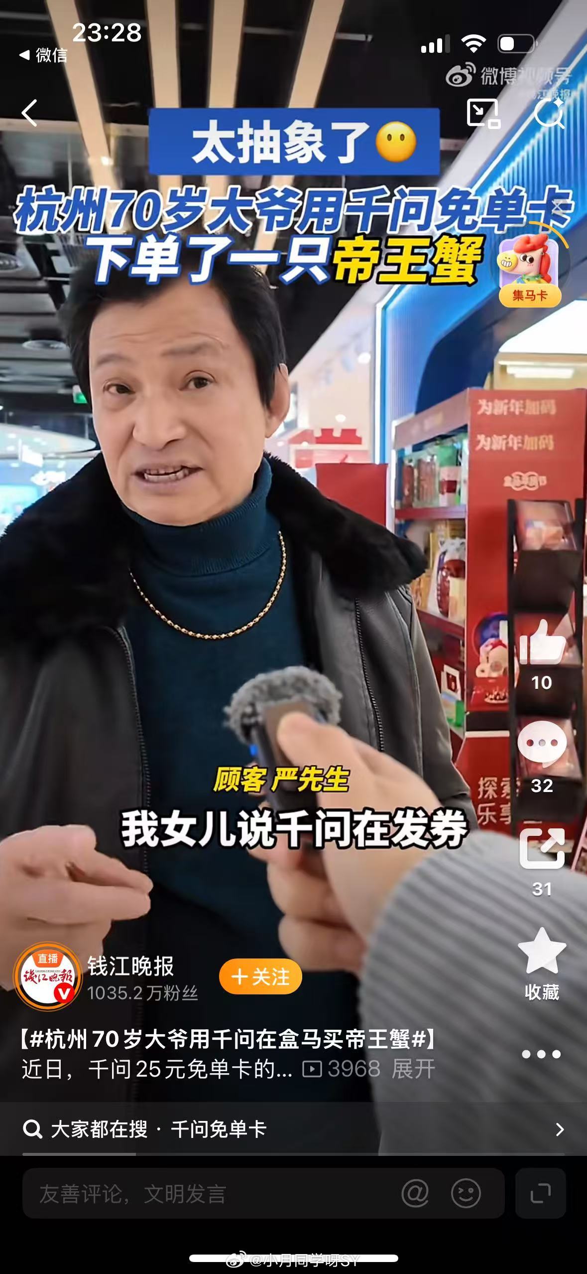 杭州70岁大爷用千问在盒马买帝王蟹杭州大爷用AI买帝王蟹,堪称“数字反哺”天花板。曾经教父母用智能手机已是难题,如今科技正悄然跨越代际鸿沟,悄然改变生活。