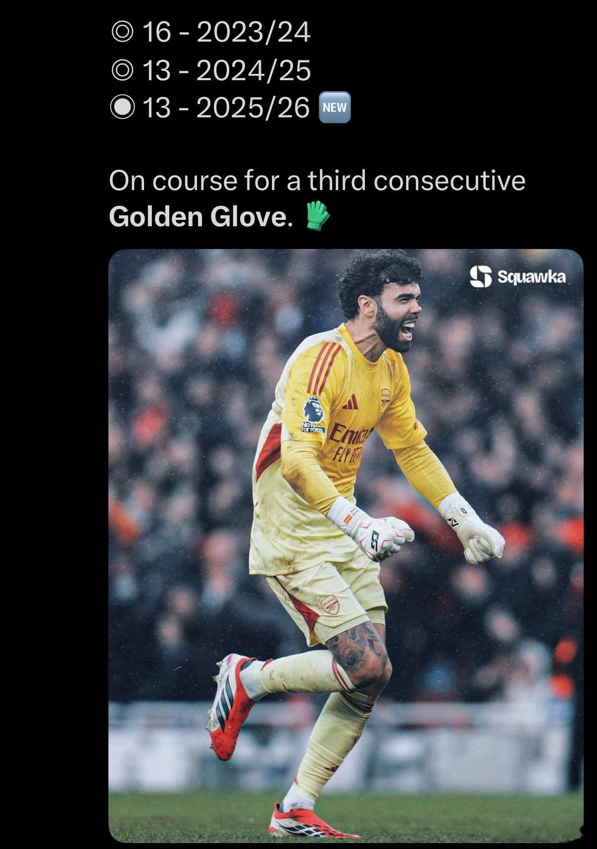 已经连续两年金手套的拉亚,本赛季英超已经零封13场,追平了上赛季的场次。而本赛季