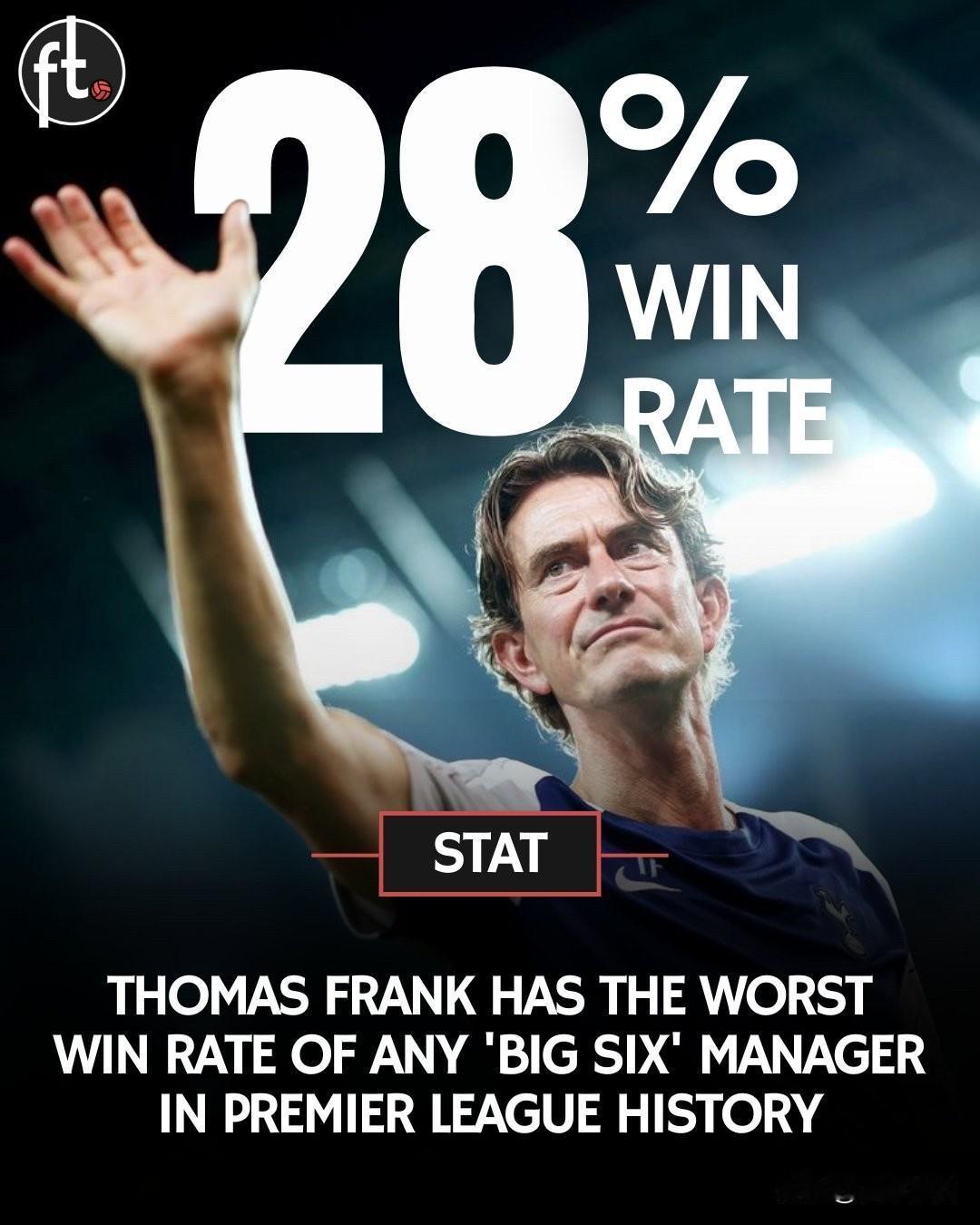 谁也救不了?弗兰克创下英超历史上“Big Six”俱乐部主帅的最差胜率纪录: 🇩🇪 朗尼克 — 胜率 41% 🏴 兰帕德 — 43% 🏴 达格利什 — 42% 🇵🇹 努诺·桑托 — 50% 🏴 马克·休斯 — 40% 🇦🇺 波斯特科格鲁 — 40% 🏴 波特 — 31% 🏴 霍奇森 — 35% 🇵🇹 阿莫林 — 32% 🇩🇰 托马斯·弗兰克 — 28%