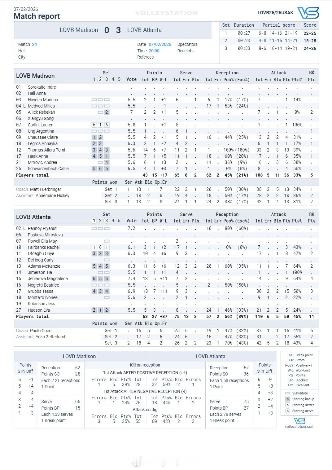 【美国LOVB女排联赛麦迪逊六连败 龚翔宇未上场】中国排球留洋动态国际排坛战报速递 2月7日麦迪逊,美国LOVB女排联赛第八轮,麦迪逊主场0-3(22-25/18-25/24-26)不敌亚特兰大,惨遭六连败,龚翔宇未上场。