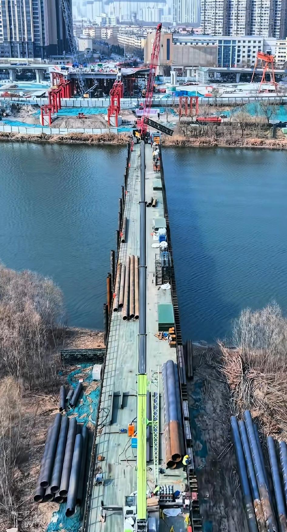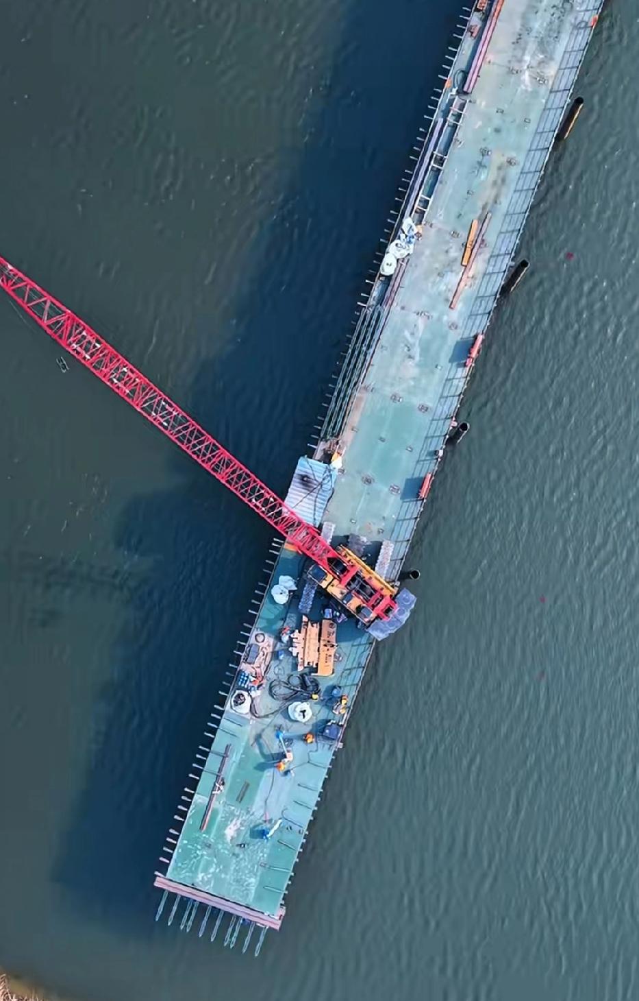 这是咸阳市彩虹一路跨渭河大桥的施工现场,目前主体施工正在紧张有序进行。彩虹一路渭河大桥北起彩虹一路与秦月路交叉口,南至段家路与世纪大道交叉口,横跨渭河及滨河西路、河堤路等,也是咸阳目前唯一一个渭河两岸均为立交的大桥。主桥为450米钢桁拱桥,双向六车道,是国内陆运施工最大跨径。大桥建成后将极大缓解三号桥和一号桥的交通压力,也将有效避免高新五号桥建成后出现的两头拥堵现象。