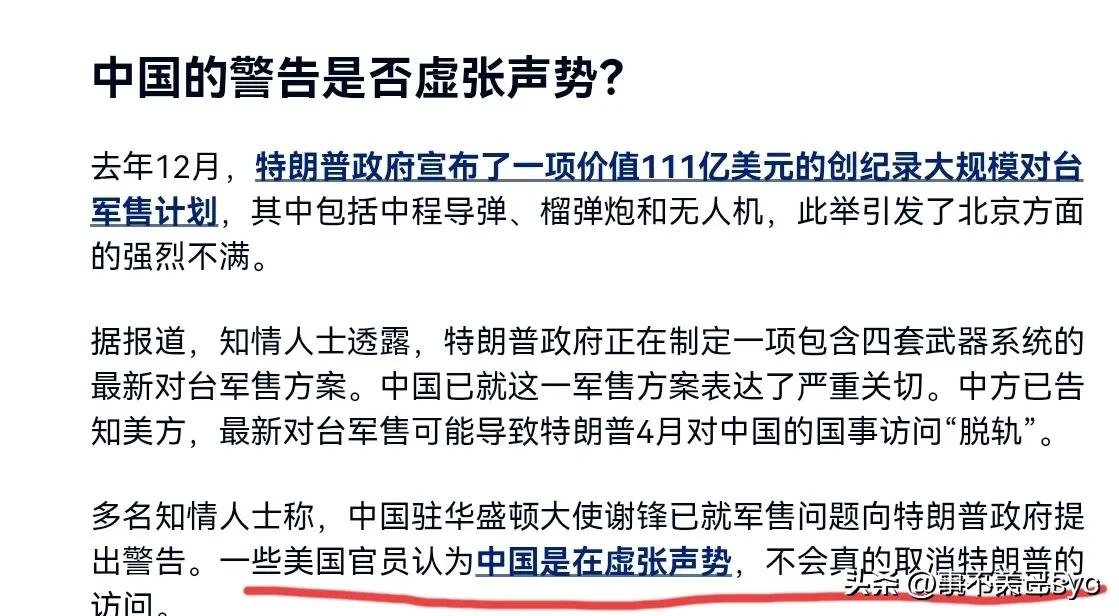 据英国媒体报道,中国已经私底下警告美国,如果美国执意对台军售将导致特朗普4月访华行程泡汤。对此,德媒认为,中国的警告极有可能是“虚张声势”,不会真的取消特朗普的访问。 德媒这一论调,只是迎合美国国内有些政客存在的侥幸心理,因此故意释放一些消息,对中国进行试探。 围绕中方就美国对台军售向美方发出的警告是否会实质影响特朗普4月访华行程,近期中美释放的信号及中方实际反制行动,成为研判事件走向的关键依据。 红线不可逾越:中国外交部多次强调,台湾问题是中国核心利益中的核心,任何对台军售行为均被视为侵犯主权和破坏台海稳定的严重挑衅。针对美方2024年12月批准的3.85亿美元及2025年11月的3.3亿美元对台军售,中方已采取反制措施,包括制裁20家美国军工企业及高管。 中方已明确提出“美方务必慎重处理对台军售问题”,而特朗普回应称“重视中方关切,承诺在任期内保持中美关系稳定”。这一互动被解读为中方将台湾问题与特朗普4月访华行程直接挂钩。分析指出,特朗普政府可能以暂缓或限制对台军售武器交付(如延迟3年执行),换取中方在增持美债、农产品采购等经济领域的合作,形成“默契平衡”。 鉴于特朗普的反复无常,特朗普的承诺是否还存在变数,还有待观察。 若美方在4月访华前未就军售问题收敛,中方可能通过调整访问规格或议程表达立场,而非直接取消行程,以保留战略回旋余地。 取消特朗普的访华行程,是双方都不愿意看到的结果。