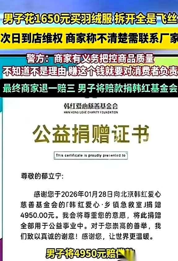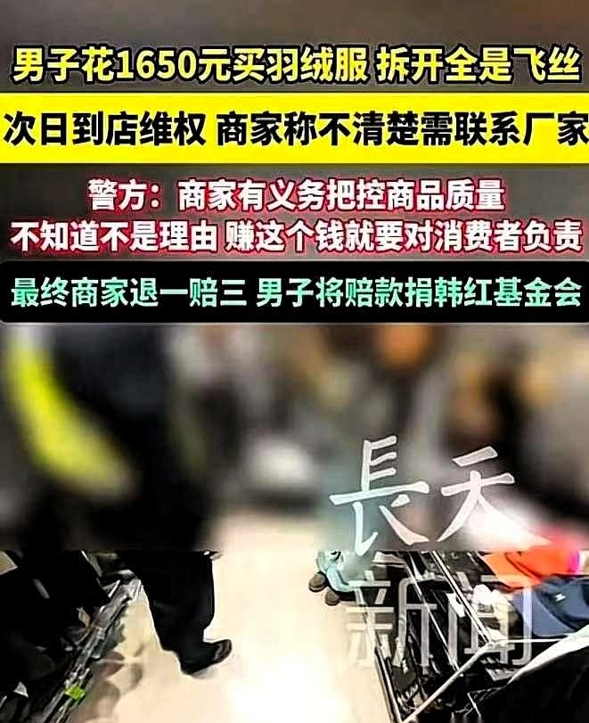 武汉一个大哥,花了1650块买了件羽绒服,刚出商场大门,刚走出商场大门,就从包里拿出剪刀,剪开了新衣服的袖子。 本以为里面是蓬松的鹅绒,结果掉出来的却是一团团灰扑扑的细碎飞丝,摸起来黏糊糊的,成本连鹅绒的十分之一都不到。 大哥没有发火,也没有大声嚷嚷,拎着剪破的衣服回到店里,把衣服往柜台上一放,平静地提出“退一赔三”。老板娘却靠在椅子上,一脸无所谓,声称自己也是被厂家骗了,让大哥去找厂家解决。 大哥没有跟她争辩,只是站在店门口,不让其他顾客进店。商场保安过来劝说,大哥始终态度坚定。老板娘见状不耐烦,索性报了警,想让警察把他劝走。 警察到场后,先听大哥讲完事情经过,又仔细查看了衣服里的填充物。随后,警察转向老板娘,语气平和却带着力度:“你是卖货的,对货品质量有审核义务,不能一句‘被厂家骗了’就推卸责任。” 老板娘瞬间没了之前的底气,眼神躲闪,说不出反驳的话。最终,她按规定退还了1650元货款,并赔偿4950元。大哥拿到6600元后,当场全部捐了出去。 这件事让人明白,消费者维权不必歇斯底里,只要掌握证据、坚守规则,就能让无良商家承担责任。而商家更该明白,诚信经营才是长久之道,耍小聪明终究会付出代价。