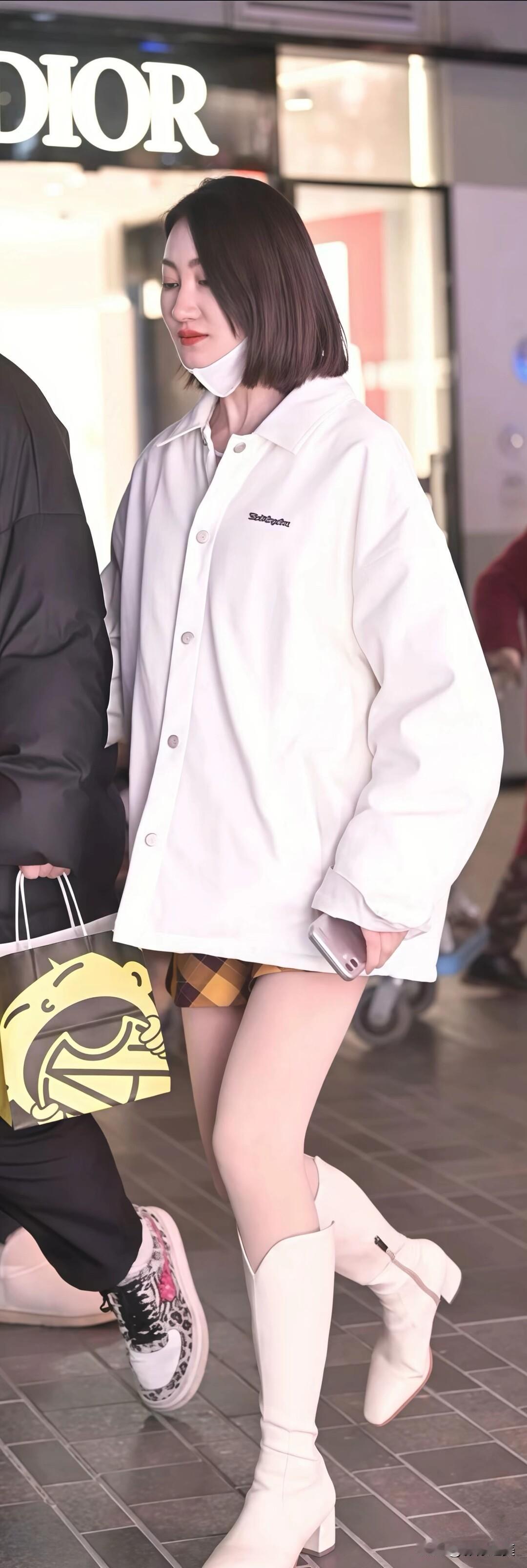 极简白色上衣的松弛感穿搭!裙子的格纹元素点亮造型,同色系长靴延伸腿线,短发利落又大气,日常通勤约会都适配。