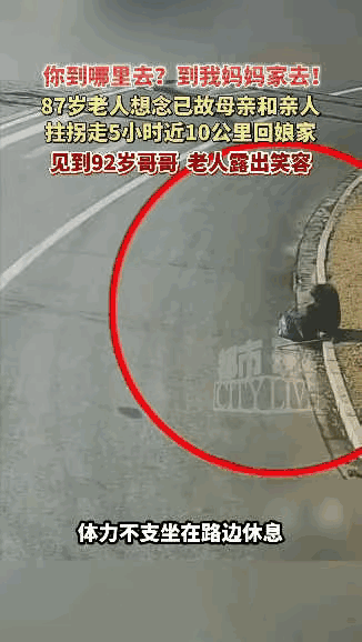 大早晨的看哭了!江苏盐城一87岁的老人,瞒着家里人凌晨5点拄着拐杖就出门了!走了将近10公里、耗时5个小时,只为回娘家见一见亲人! 老人走到体力不支坐在国道边休息,巡逻民警开车路过看到老人就停下车问老人需不需要帮忙,老人一句话让民警眼眶湿润了! 巡逻的民警停下车,走近时看到老人喘着粗气,拄着拐杖,民警问老人到哪里去?怎么一个人在这儿? 老人抬头看了看民警说:我要到妈妈家去,我想我妈了! 老人一句话让在场的人都湿了眼眶! 老人姓曹今年87岁儿孙满堂!眼看着就要过年了,在外工作的儿孙们也都陆续回了家,老人却想起了自己过世的妈妈,还有92岁的哥哥! 民警了解情况后,把老人扶上了车又给老人的儿子打了电话报了平安!之后,民警又按着老人指的路线,把老人送到了哥哥家! 妈妈!无论多大年纪都是自己心中的依靠!无论多大年纪都会想念自己的妈妈! 文中的老人很幸福,虽然妈妈不在了但还有92岁的哥哥!还有娘家可以回!祝福老人健康长寿!祝福天下所有的爸爸妈妈健康长寿!