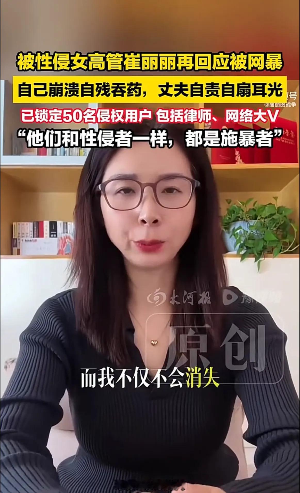 被性侵女高管崔丽丽再度回应被网暴!自己崩溃了,做出了自残吞药的行为,丈夫也非常的自责扇,自己的耳光。 崔丽丽表示,自己不仅不会消失,反而还会拿起法律的武器维护自己的合法权益,已经锁定了50名侵权用户,包括一些律师和网络大v。 在她公开自己被性侵的经历后,网络上的恶意就像潮水一样涌来。有人说她“博眼球”“想上位”,有人翻出她的过往经历恶意揣测等等一系列的质疑。 她在视频里红着眼眶说,那些网暴者和当初性侵她的人没什么两样,都是在对她施暴。性侵是身体上的伤害,网暴却是把刀架在她的心上,日日夜夜凌迟。她撑不下去的时候,选择了吞药自残,想彻底解脱,丈夫发现后抱着她崩溃大哭,不停地扇自己耳光,怪自己没能保护好她。 崔丽丽说她不会消失,她要把这些施暴者告上法庭。这不是为了报复,而是为了讨一个公道,也是为了告诉所有被网暴的人,你们不必沉默,法律会站在正义这边。 各位读者你们怎么看?欢迎在评论区讨论。