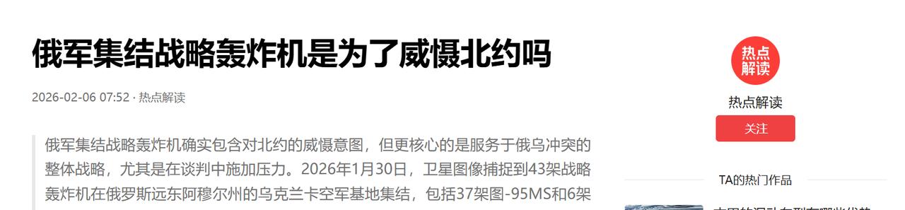 最后一击!俄中将遭枪击后,出动43架核轰炸机,普京找中国留后路 最近国际局势可谓波谲云诡,俄罗斯这边刚发生一起震动朝野的刺杀事件,转头就亮出了最硬核的肌肉,而普京的一系列动作,更被外界解读为在为俄罗斯寻找最稳固的退路,核心方向直指中国。 事情要从几天前说起,当地时间2月6日清晨,俄罗斯首都莫斯科的一处居民楼里,发生了一起恶性枪击事件。被袭击的不是普通人,而是俄军总参谋部情报总局的第一副局长阿列克谢耶夫中将,这位64岁的老将,是普京亲自授勋的重臣,手握俄军核心情报,深度参与俄乌冲突的情报统筹和敌后部署,堪称俄罗斯情报系统的“二把手”。 当时阿列克谢耶夫正准备出门,一名不明身份的枪手在楼道里近距离伏击,用改装的消音武器朝他背部连开数枪,中将当场倒在血泊中,被紧急送医后至今仍未脱离生命危险。行凶者得手后迅速逃离,没留下任何明显线索,俄罗斯已经成立联合调查组,彻查幕后主使,普京也第一时间得知消息,下令必须严惩所有涉案人员。 可能有人不知道,这已经不是近期俄军高层第一次遇袭了,短短45天里,这是第二位遭致命袭击的俄军中将,而且袭击地点从边境直接蔓延到了莫斯科核心区,明眼人都能看出来,这是对俄罗斯军政权威的公然挑衅,大概率和乌克兰及西方情报机构脱不了干系。 而就在中将遇袭的阴霾还没散去,俄罗斯就亮出了一记重拳——43架核轰炸机罕见集结。根据卫星图像显示,这些轰炸机部署在俄罗斯远东阿穆尔州的空军基地,其中包括37架图-95MS和6架图-160,规模之大,是冷战结束后都少见的。 很多人疑惑,俄罗斯为什么要在这个时候出动这么多核轰炸机?而且还要部署在距离乌克兰边境6000多公里的远东?其实原因很简单,一方面是为了威慑,另一方面是为了自保。此前乌克兰曾用无人机袭击过俄境内的空军基地,损失不小,远东基地远超乌克兰无人机和导弹的射程,能有效保护这些“国之重器”。 更关键的是,这时候亮出肌肉,恰逢美俄乌第二轮谈判前夕,双方在领土问题上陷入僵局。俄罗斯这是在用最直白的方式告诉西方和乌克兰,谈判桌上拿不到的东西,战场之上有能力争取,这些轰炸机一次出动就能投射数百枚远程导弹,足以形成饱和打击,倒逼乌克兰在谈判中让步。 但俄罗斯也很清楚,仅凭军事威慑远远不够,西方的制裁正在全方位围堵俄罗斯。就在近期,欧盟提议推出第20轮对俄制裁,全面禁止俄罗斯原油海运,新增43艘俄籍船舶列入黑名单,还收紧了金融和贸易限制,试图切断俄罗斯的经济命脉,这对俄罗斯来说,无疑是雪上加霜。 正是在这样的背景下,普京开始主动加强与中国的互动,这也被外界解读为“找中国留后路”。短短72小时内,普京接连派遣两名核心重臣访华,随后亲自与中方启动视频会晤,这份重视远超以往。双方不仅敲定了能源合作的细节,“西伯利亚力量”天然气管道的输气量创下新高,还在多边平台上达成共识,深化战略协作。 其实所谓的“留后路”,并不是依附,而是俄罗斯的清醒选择。在西方持续施压、东西双向受困的情况下,中国是俄罗斯最可靠的战略伙伴,中俄深化合作,既能帮助俄罗斯规避西方制裁,稳定经济局势,也能在国际舞台上相互支撑,维护共同的利益。 现在的局势很明确,俄罗斯一边用核轰炸机威慑对手,为谈判加码;一边深化对华合作,破解西方围堵。普京的每一步都走得很谨慎,也很有章法,既没有放弃核心利益,也为俄罗斯的未来留足了空间。毕竟在复杂的国际博弈中,唯有强强联手、稳步前行,才能在风浪中站稳脚跟,而中俄协作,也必将成为影响未来国际局势走向的重要力量。 信息来源:热点解读