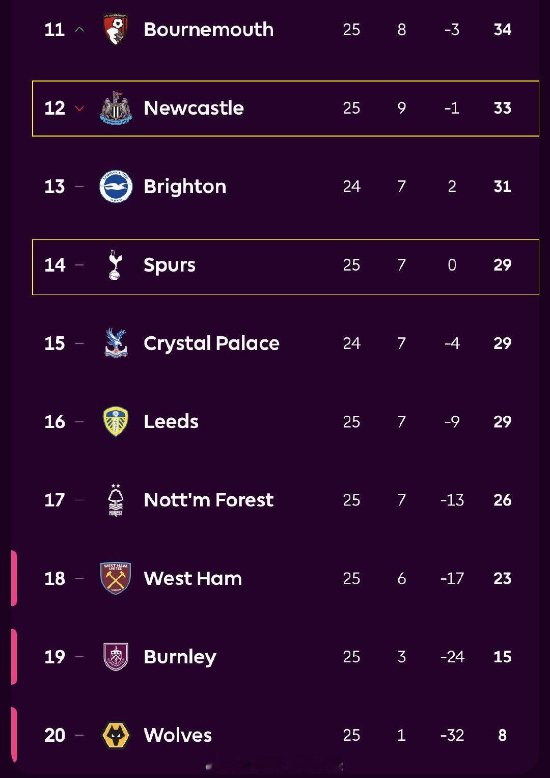英超25轮过后,排名第5位的切尔西已经达到43分,而另外两支有意争五的球队,纽卡斯尔联只有33分,热刺更加只有29分,两队明显被其他争五球队抛离,联赛只剩下13轮的情况,你觉得纽卡和热刺有机会追上来吗?