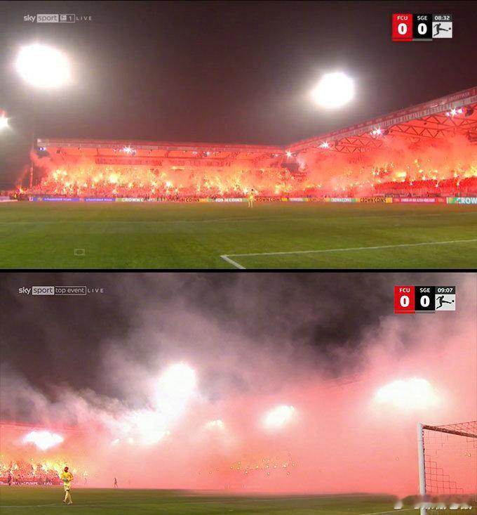 【看不见】柏林联球迷为了庆祝俱乐部成立60周年,在对法兰克福的比赛中燃放了大量焰火,导致场地内一度烟雾弥漫,能见度极低,裁判不得不暂停比赛。德甲
