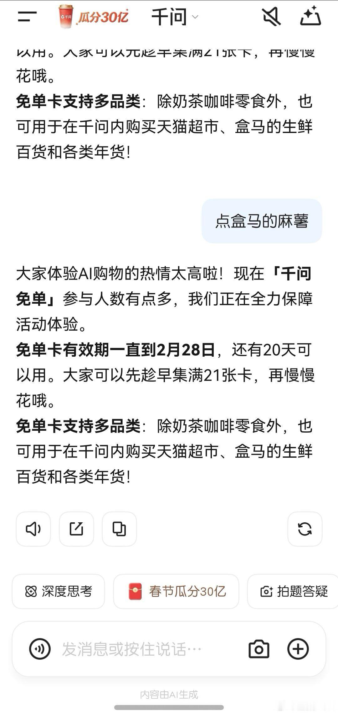 千问系统太火爆,大家要记得不仅可以点奶茶,盒马的美食也是可以点的!我还有13张免单卡,可以一直用到本月28日!你有几张免单卡呢?