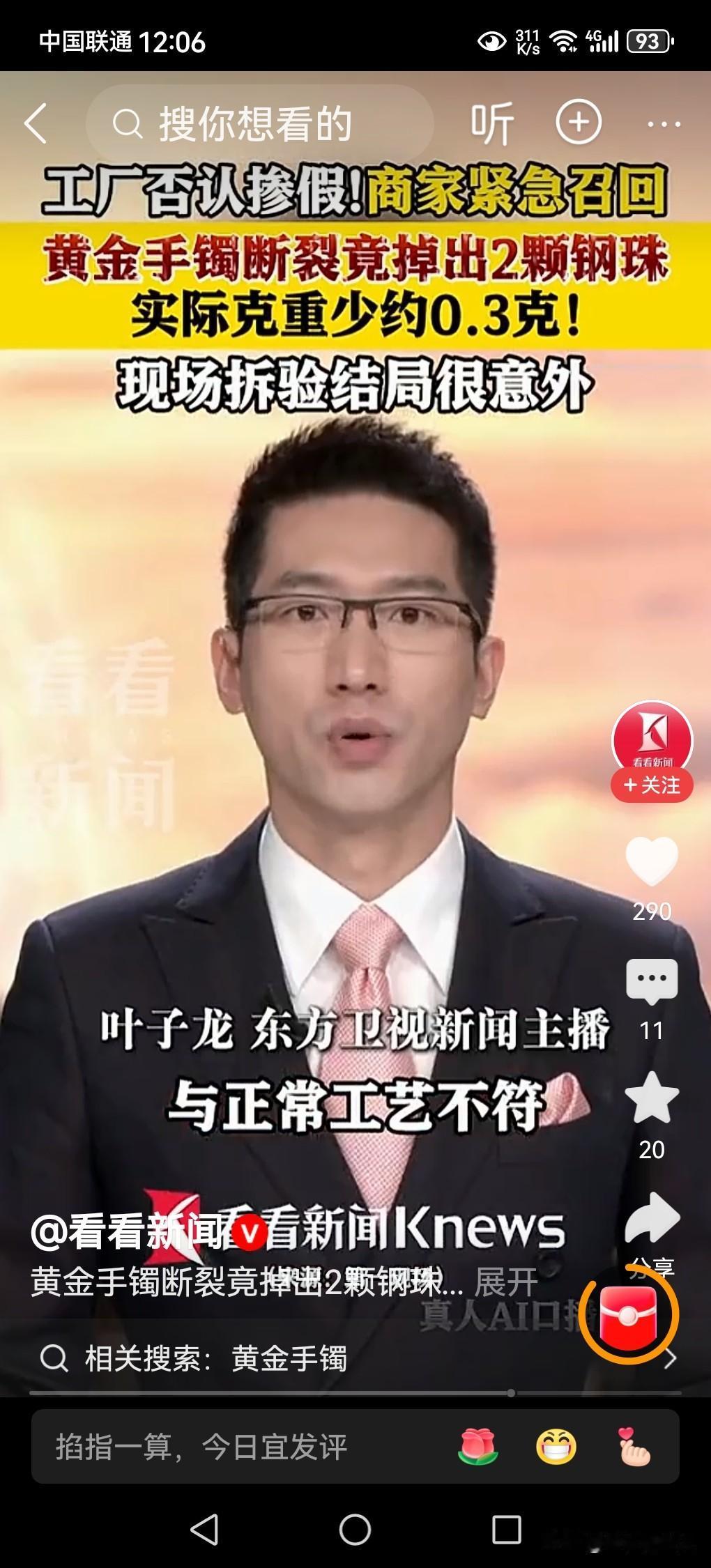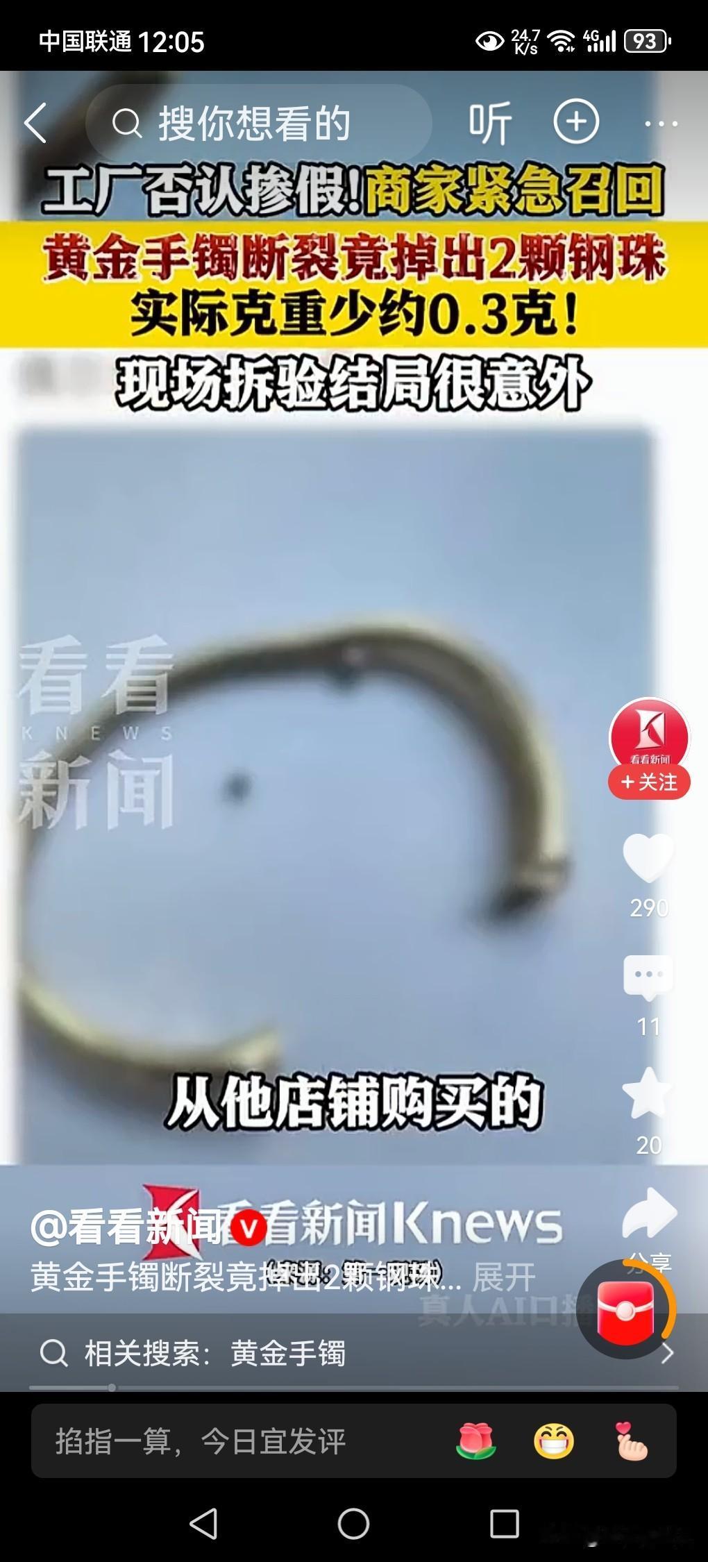 黄金手镯断裂竟掉出2颗钢珠! 黄金首饰造假现象,并不是一种新鲜的事,是一种屡见不鲜的难于把控的事情。 据媒体2月8日报道,某一金店老板,接到顾客的反馈,在该店所买的一款手镯断裂以后,竟然掉出两颗钢珠,占重0.3克。这个金店的金手镯,是商店老板委托一黄金加工厂家制作而成的,一共有7个产品。经联系,厂家否认该手镯的掺假现象。老板于是召回了这7个产品以后,发现有两个手镯存在有水痕的现象,与加工标准不相符,但没有再次发现手镯中有钢珠的现象。这样一来,让老板损失2万多元。 通过此事例回到我们现实的生活中来,本人有几个建议,提醒大家,一是购买黄金首饰要理性,不要盲动,要到正规的商家处购买就有产品质量的保障,否则容易上当受骗。 二是购买黄金首饰,首先要对黄金首饰的基本知识有所了解,多学习相关的金银首饰的基本知识,学会鉴赏产品质量,要擦亮眼睛,认真审视查看,避免买到假冒伪劣产品,造成经济上的损失。 以上是本人观点,如有不妥,请大家在留言区中,留下你宝贵的意见,并积极参与评论,特邀请大家关注生活问题。